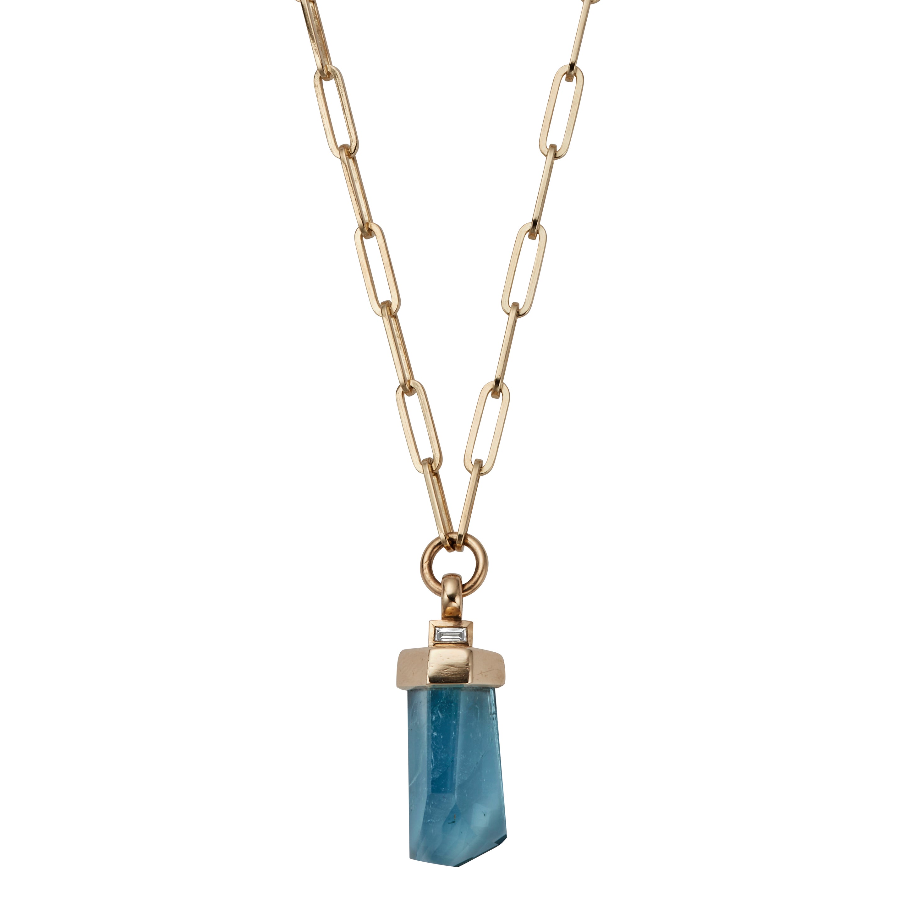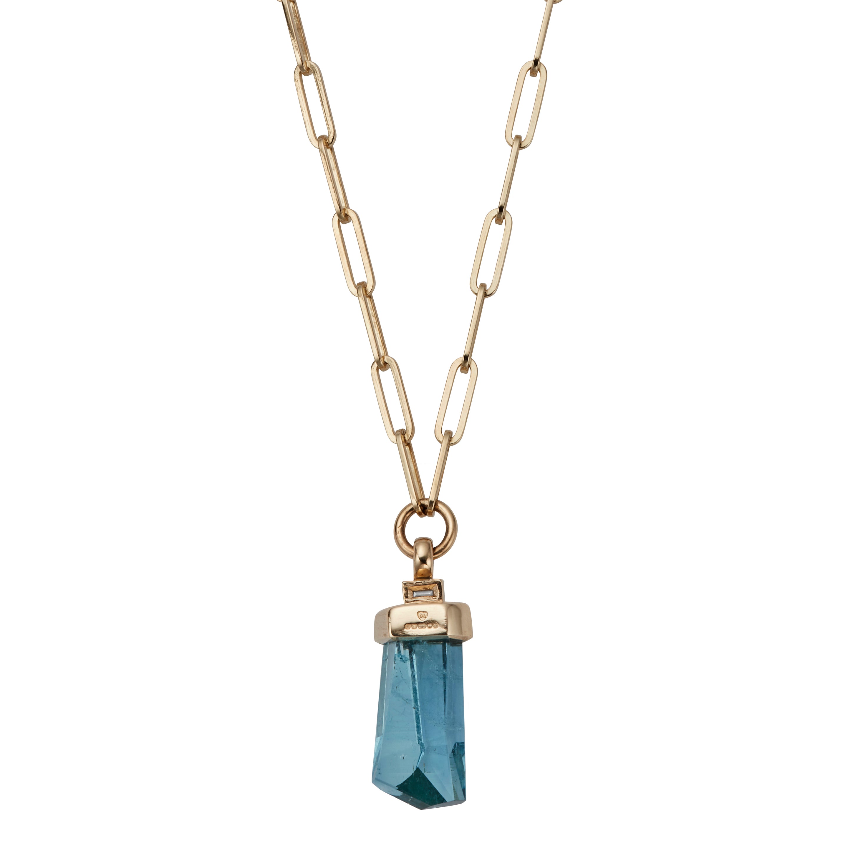 A beautiful 14ct aquamarine has been lovingly hand set into a 9ct yellow gold setting and paired with a trace chain to create this unique new design. Named Aisa, translating to 'living prosperous'.