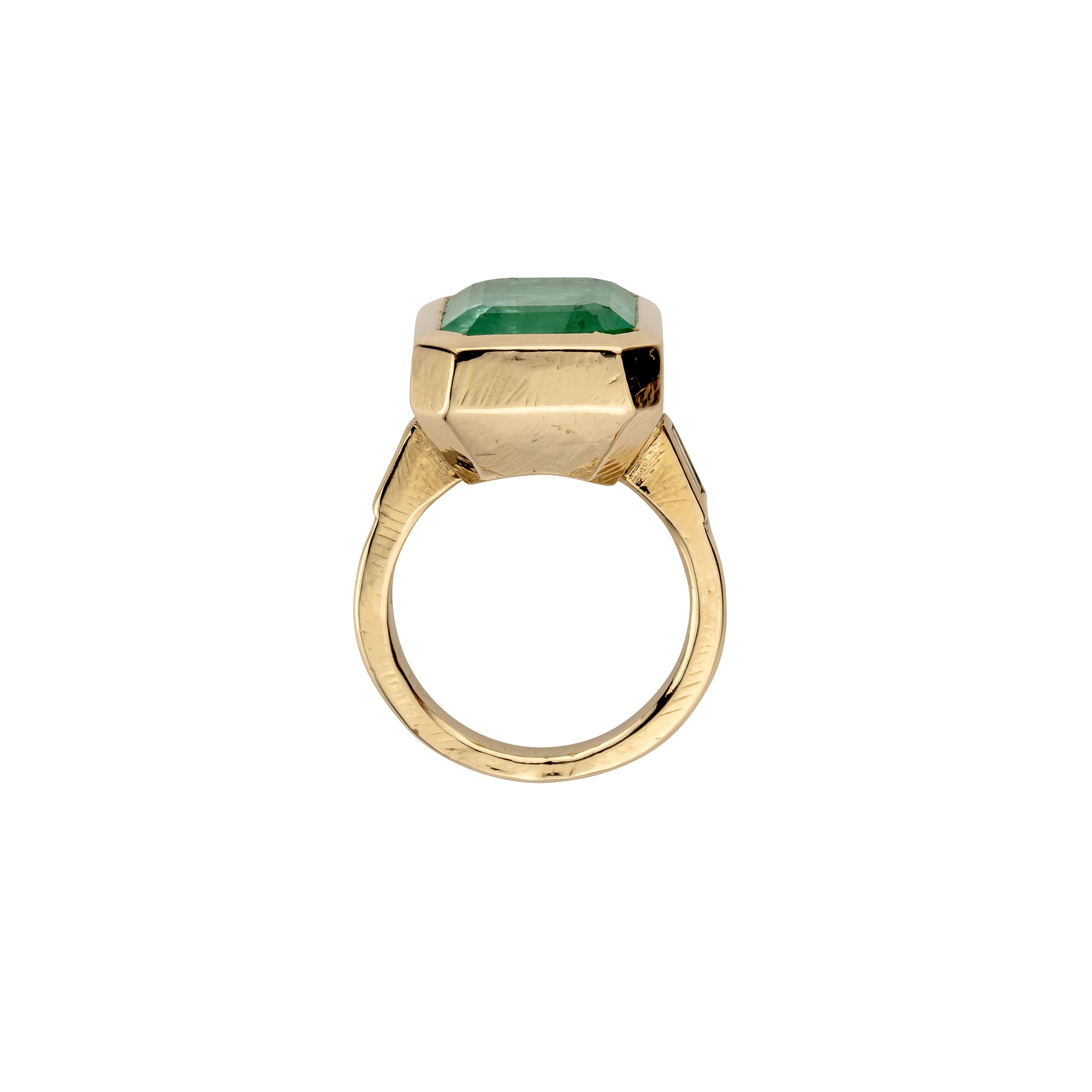 A beautiful hand carved and bespoke Emerald and Diamond Gold ring. Daniella designed the ring to be weighty yet comfortable and feminine. Daniella fell in love with the deep vibrant green of this Emerald so the shank was made simple yet chunky in gold to enhance the beautiful stone.