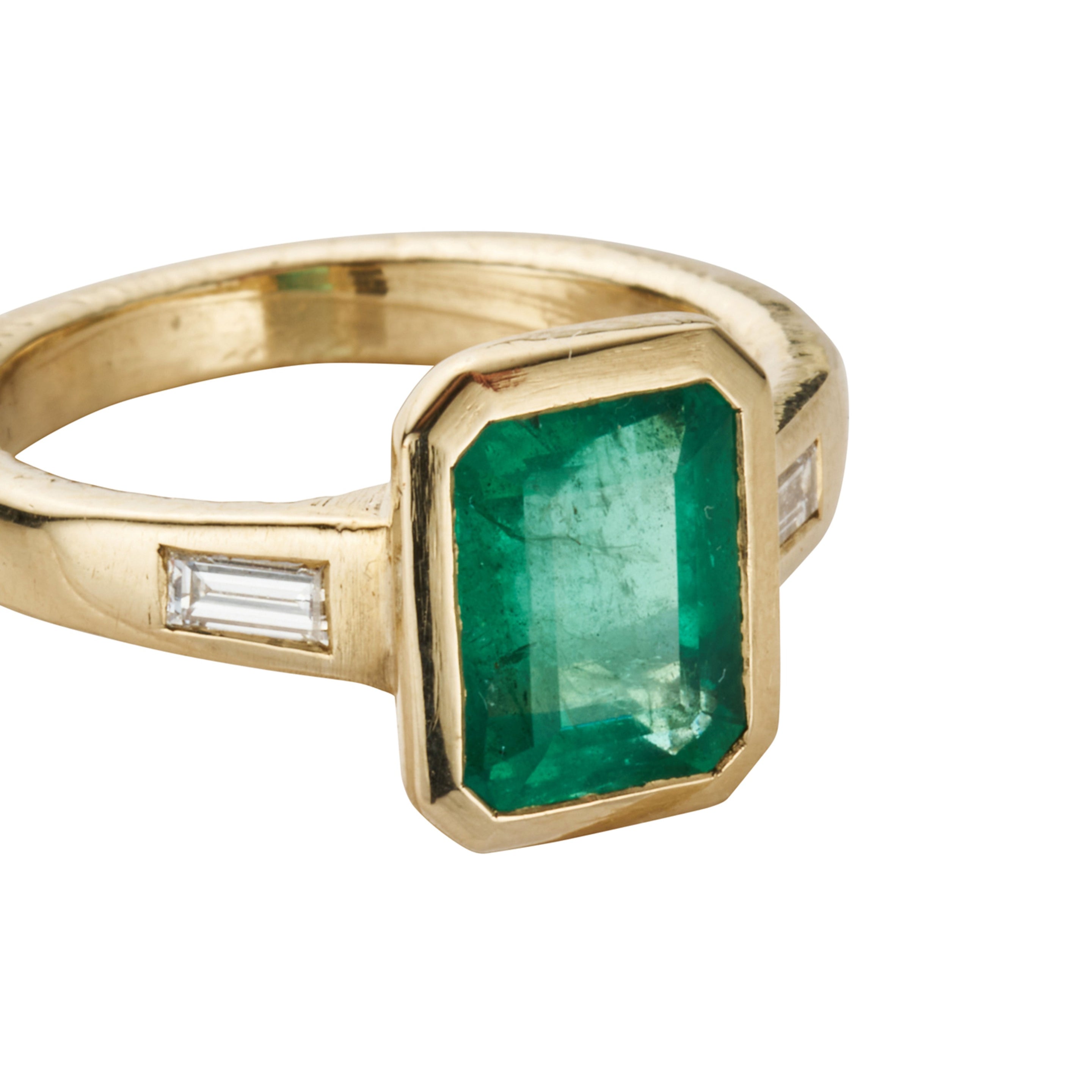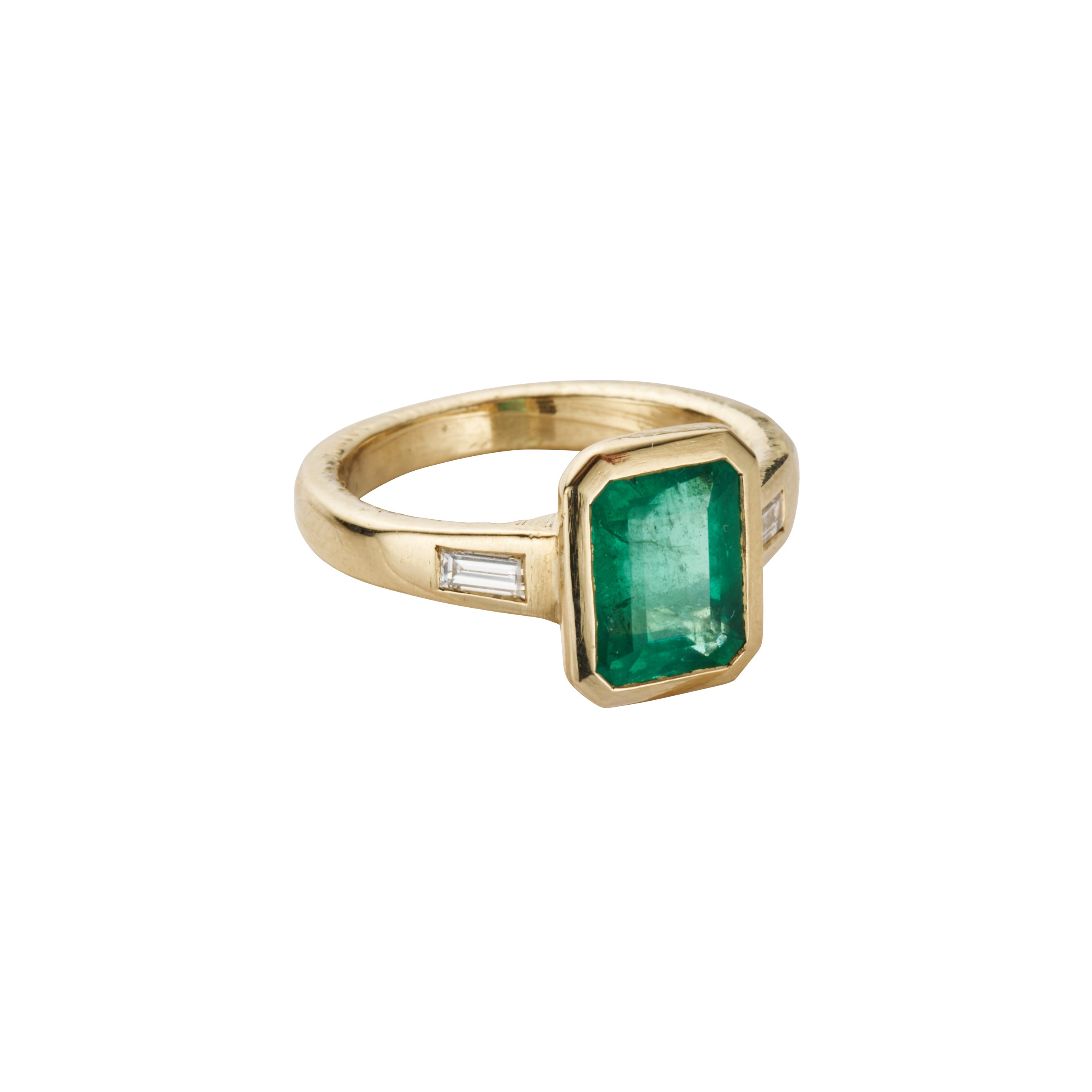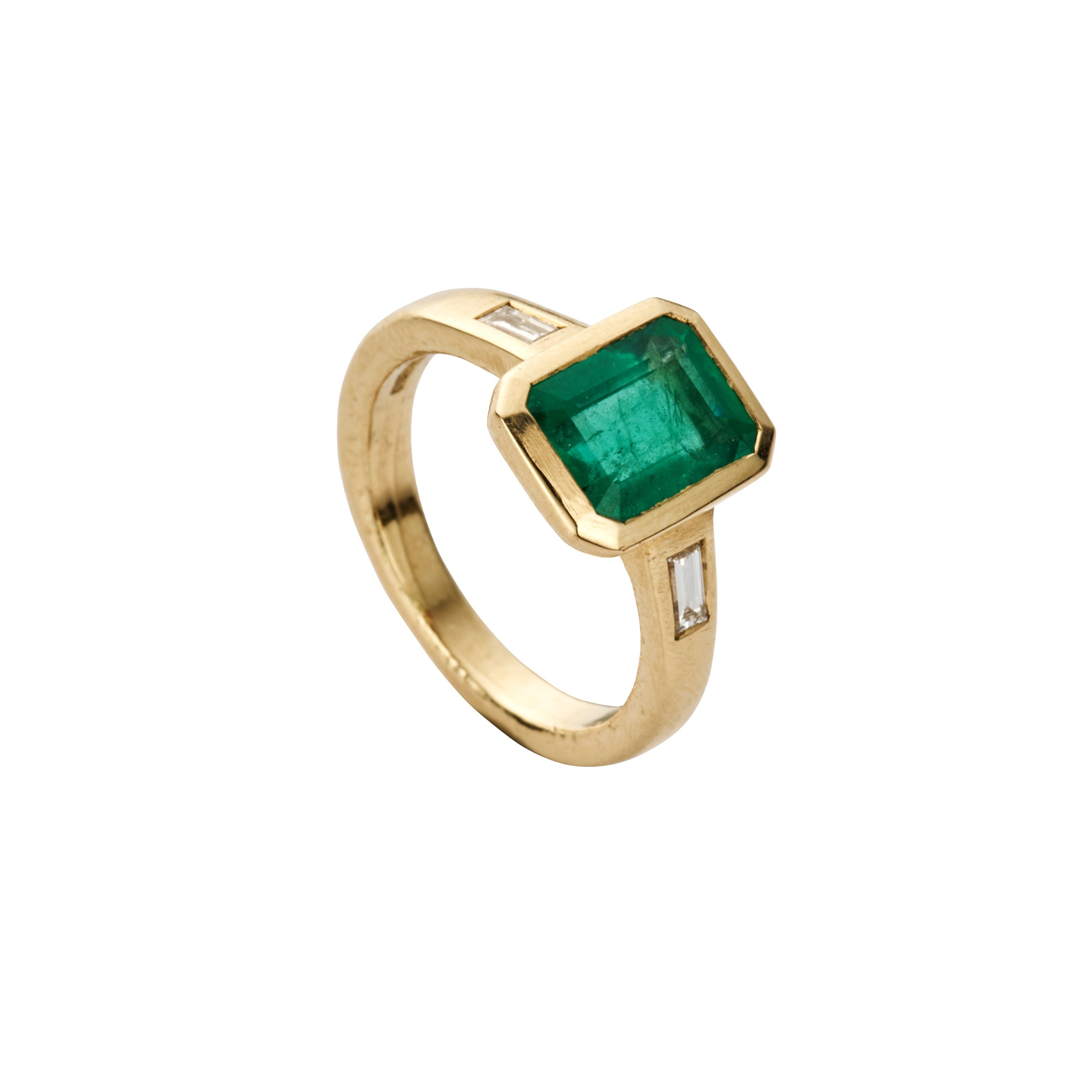 An 1.95ct emerald has been lovingly hand set into a 9ct yellow gold setting paired with two baguette diamonds to create this unique design. Named Arabella translating to "beautiful".