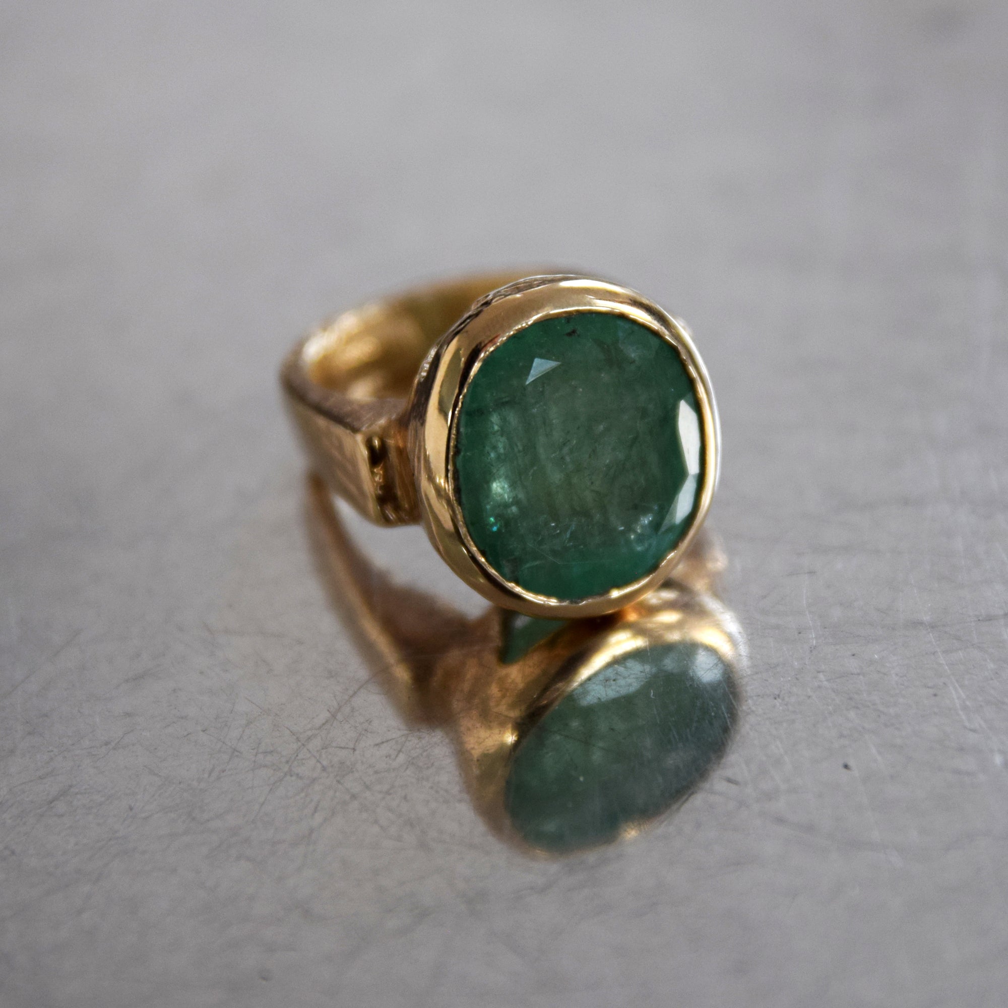 This is a beautiful, bespoke and hand-carved emerald ring. The carved out shapes on the setting allow the light to shine through to the stone. Aurelia means "golden" in Latin.
