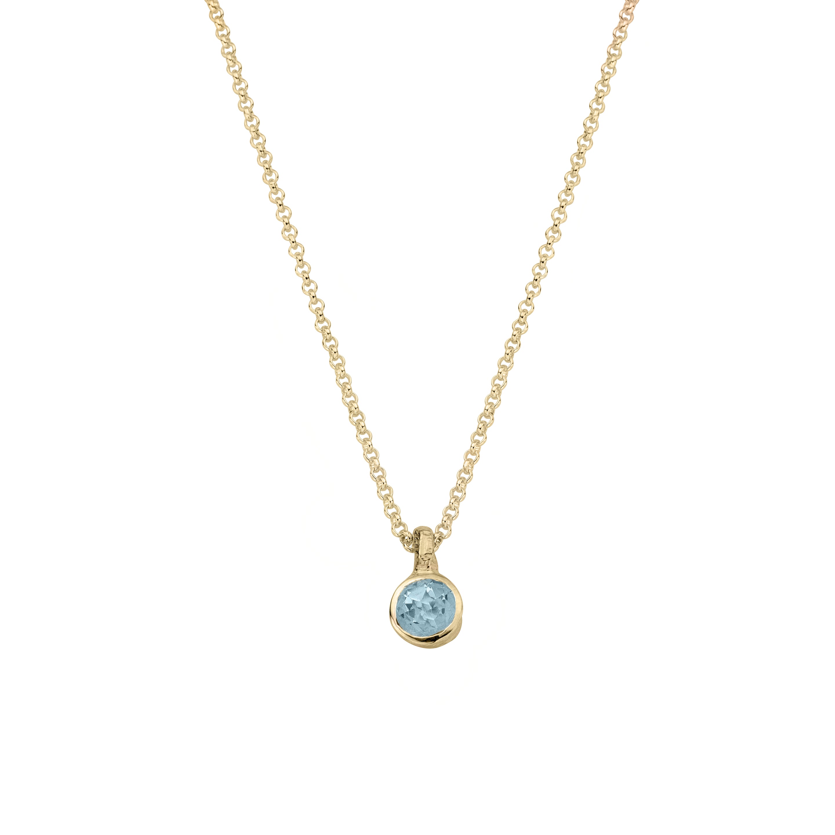 This is a solid 9ct gold Aquamarine Baby Treasure Necklace. An effortlessly elegant piece, this pendant shimmers with the natural blue & turquoise hues of the Aquamarine, the stone of eternal youth and happiness. The birthstone for March, Aquamarine was believed to be the treasure of mermaids, and was used by sailors as a talisman of good luck, fearlessness & protection. This pendant would make very vibrant addition to your jewellery collection or the perfect gift for a loved one.