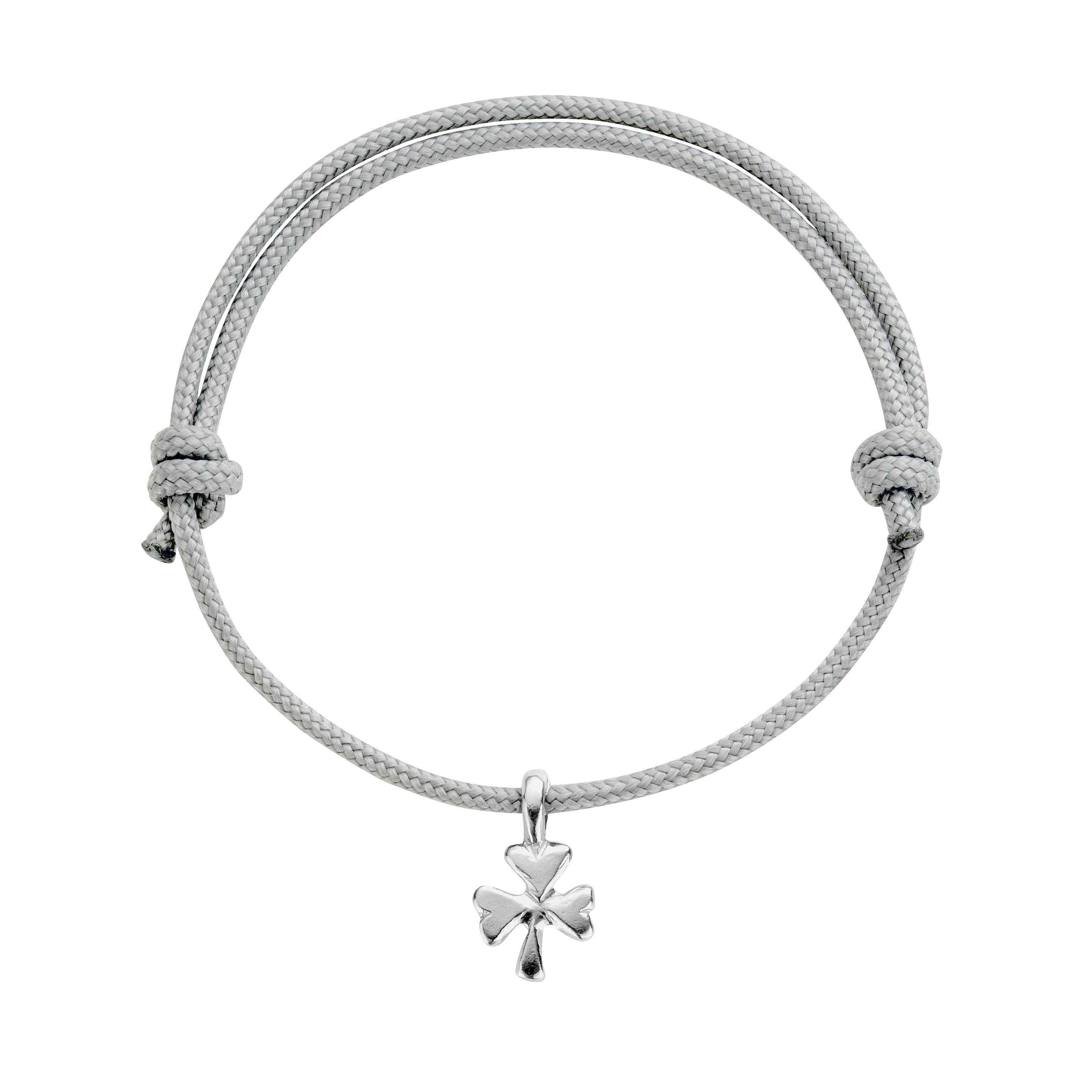 The Baby Shamrock Charm, made using 100% recycled solid sterling silver, is threaded onto an adjustable sailing rope. One of our most popular and easy to wear pieces, this sailing rope comes in three colours: black, pink or grey.