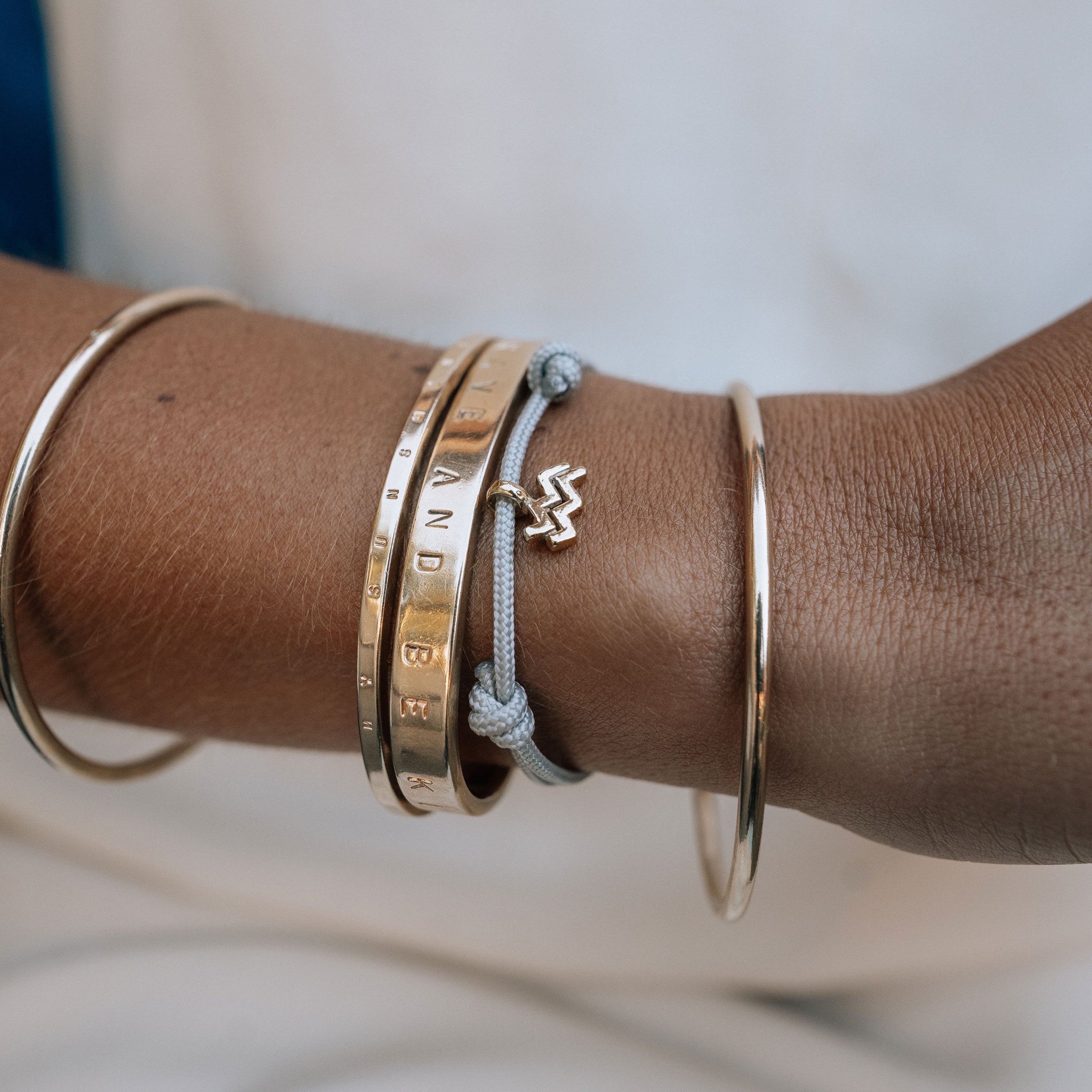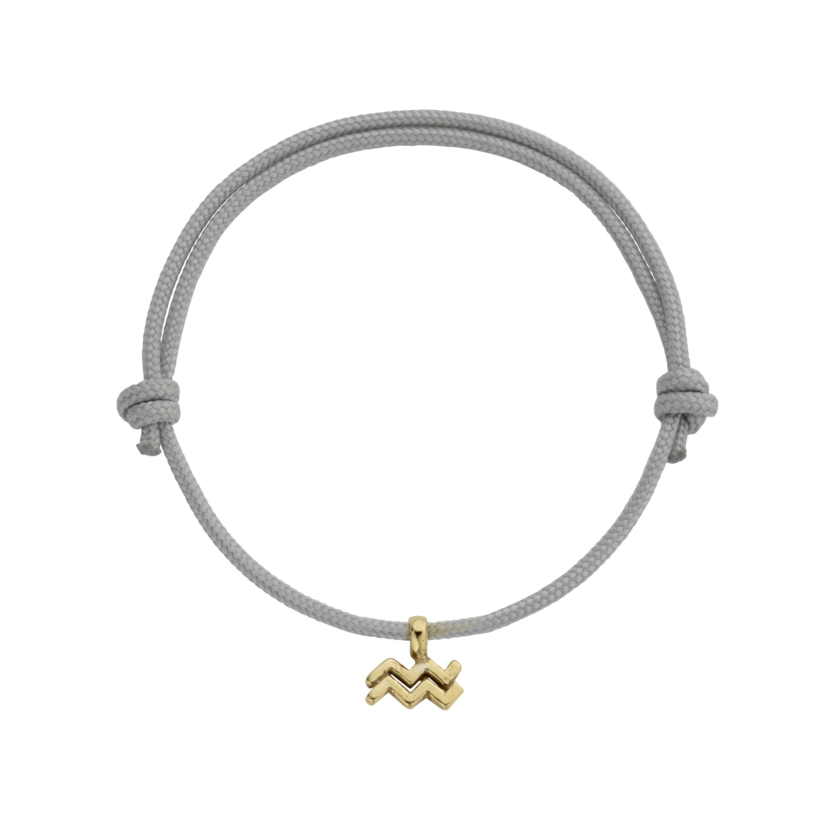 The Mini Aquarius Horoscope Charm, made using 100% recycled solid 9ct gold, is threaded onto an adjustable sailing rope. One of our most popular & easy to wear pieces, this sailing rope comes in three colours: black, pink or grey.