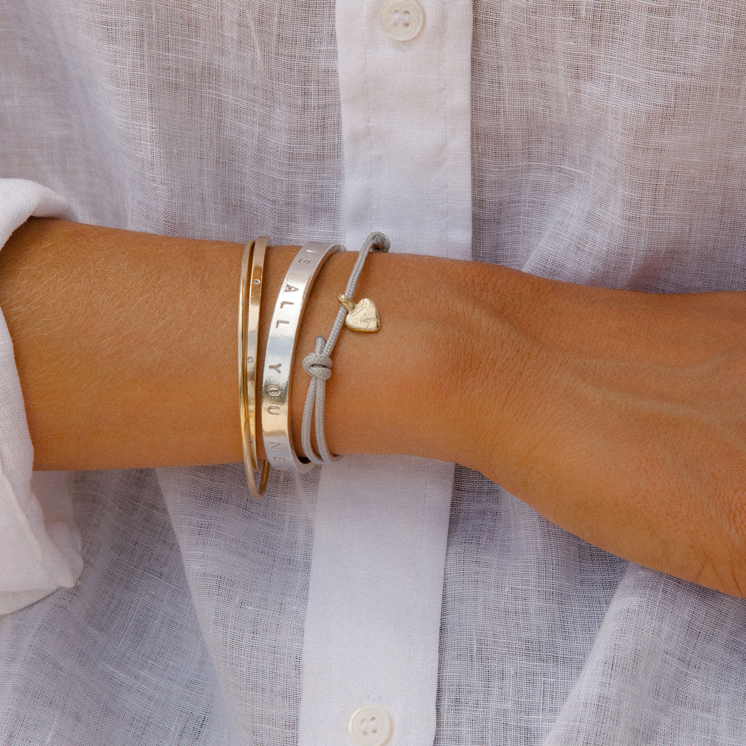 The Baby Heart Charm, made using 100% recycled solid 9ct yellow gold, is threaded onto an adjustable sailing rope. One of our most popular and easy to wear pieces, this sailing rope comes in three colours: black, pink or grey.