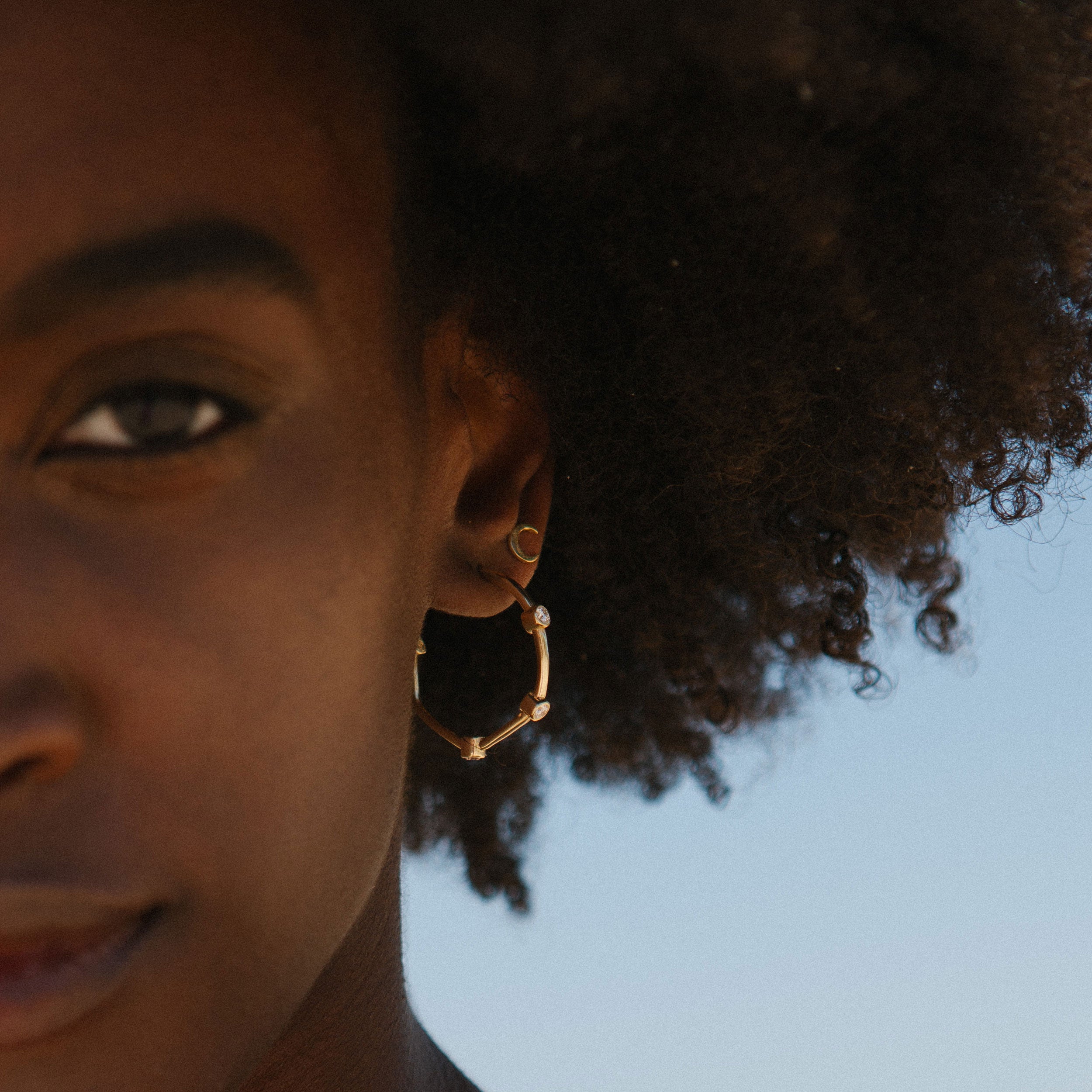 The beautiful Maxi Midnight Hoop Earrings are made using 100% recycled solid 9ct yellow gold and are set with three diamonds. Looking to design the perfect pair of earrings to accompany the classic Midnight Moon Necklace, the Maxi Midnight Hoops were born.