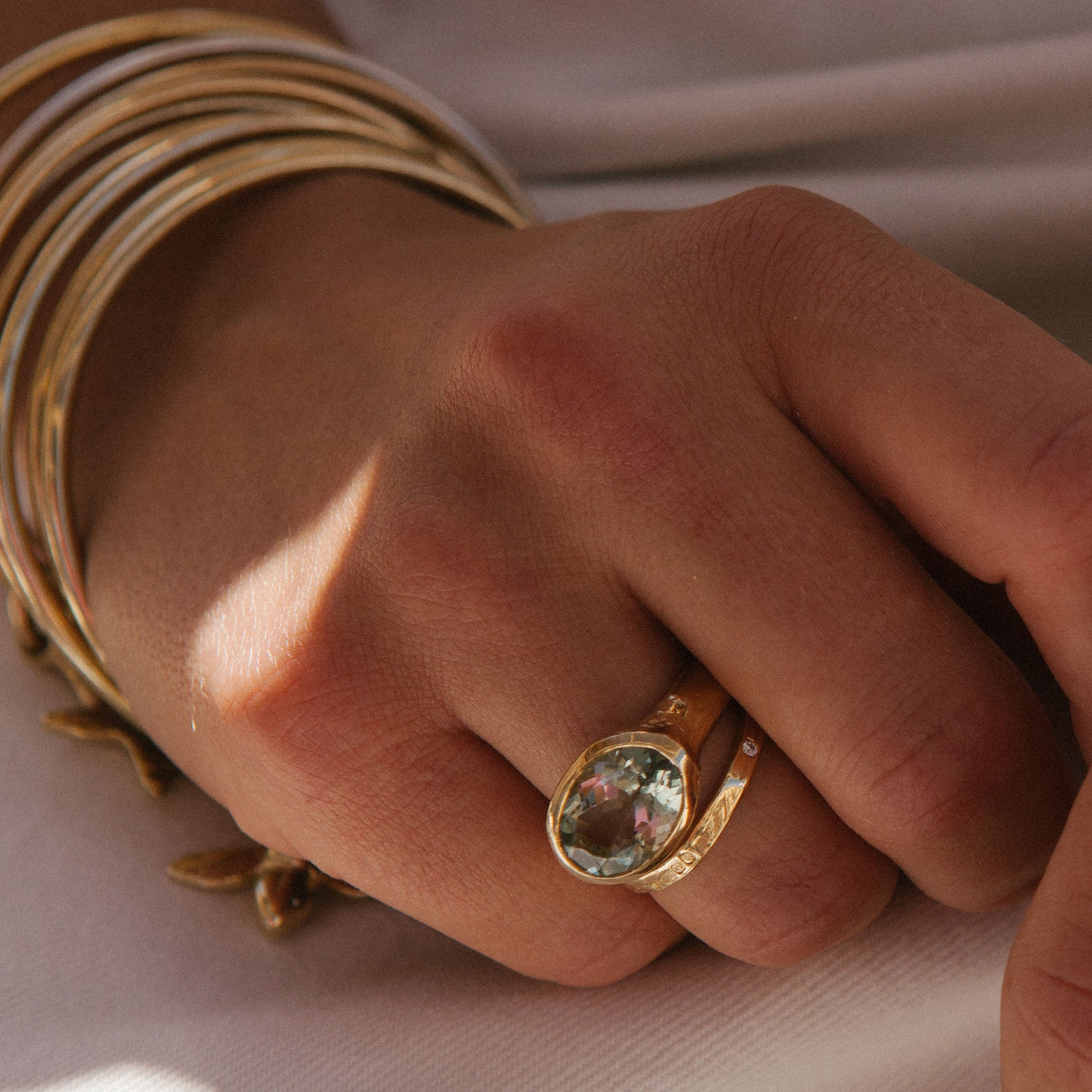 The Gold Green Quartz Treasure Ring carries the energy of renewal and growth, making it a meaningful addition to your collection. Wear it as an embodiment of your personal style or as a symbol of rejuvenation.