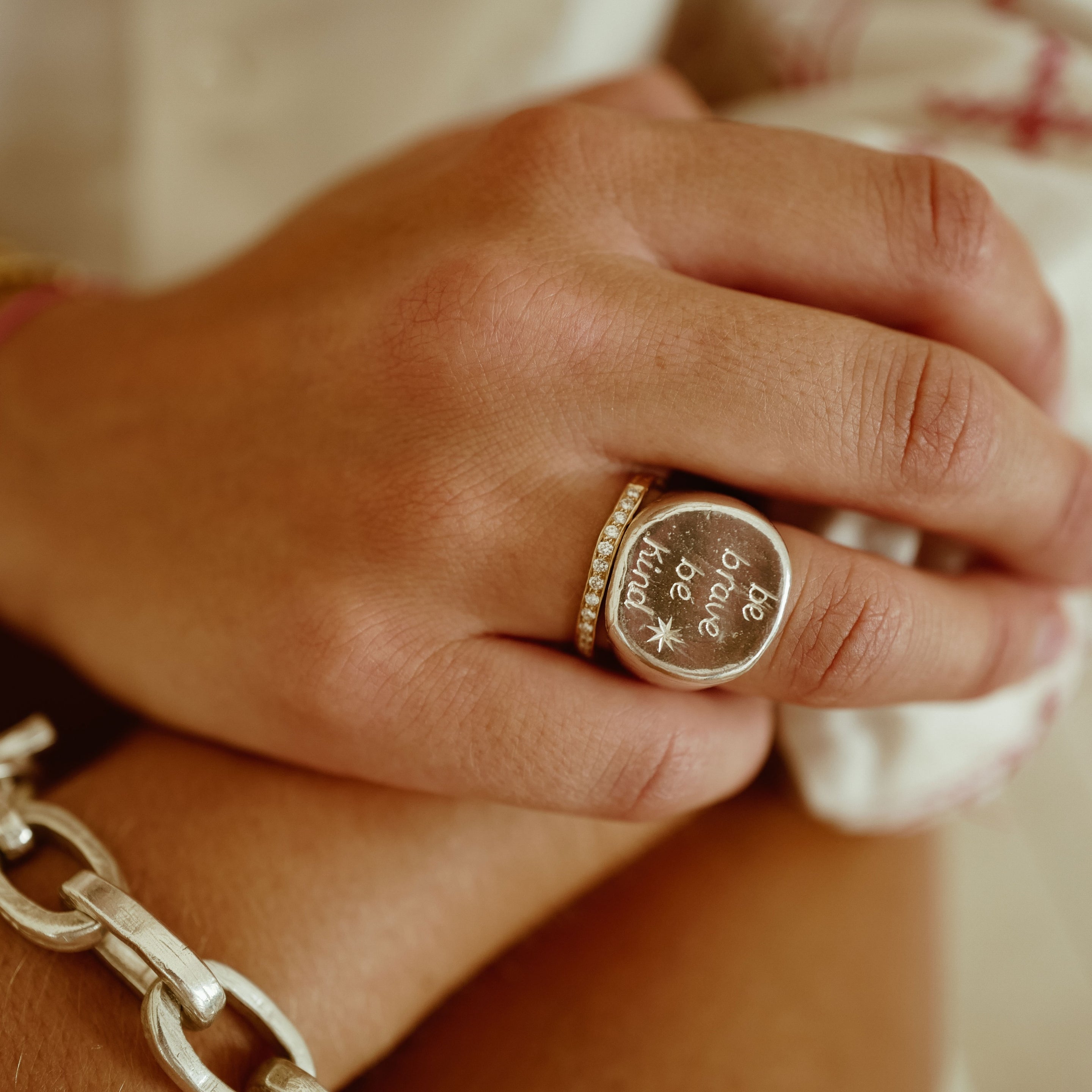 Lovingly engraved with the mantra ‘Be Brave Be Kind’ and set with a sparkly diamond, this powerful message serves as a reminder of the virtues we should all live by. Solid and bold, its rustic style gives a subtle twist on a classic design.