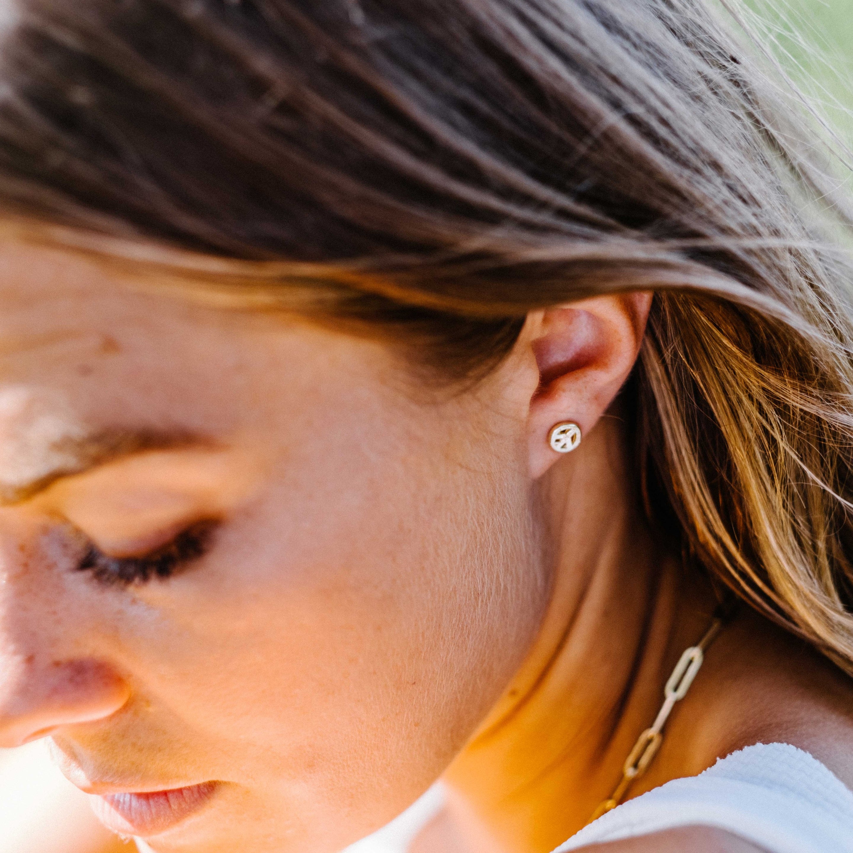 This pair of Gold Little Peace Ear Charms are the latest addition to Daniella's collection of stud earrings & are made using 100% recycled solid 9ct yellow gold.