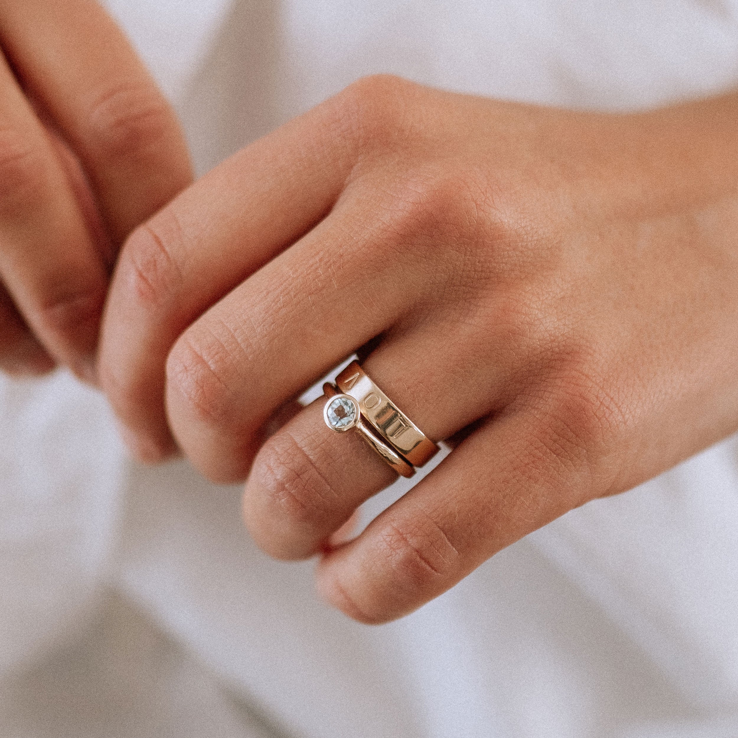 Make this ring uniquely yours with our complementary hand stamping service. Whether its a name, a meaningful word or a cherished date, have up to 15 letters hand stamped with love to turn your ring into a true signature piece.