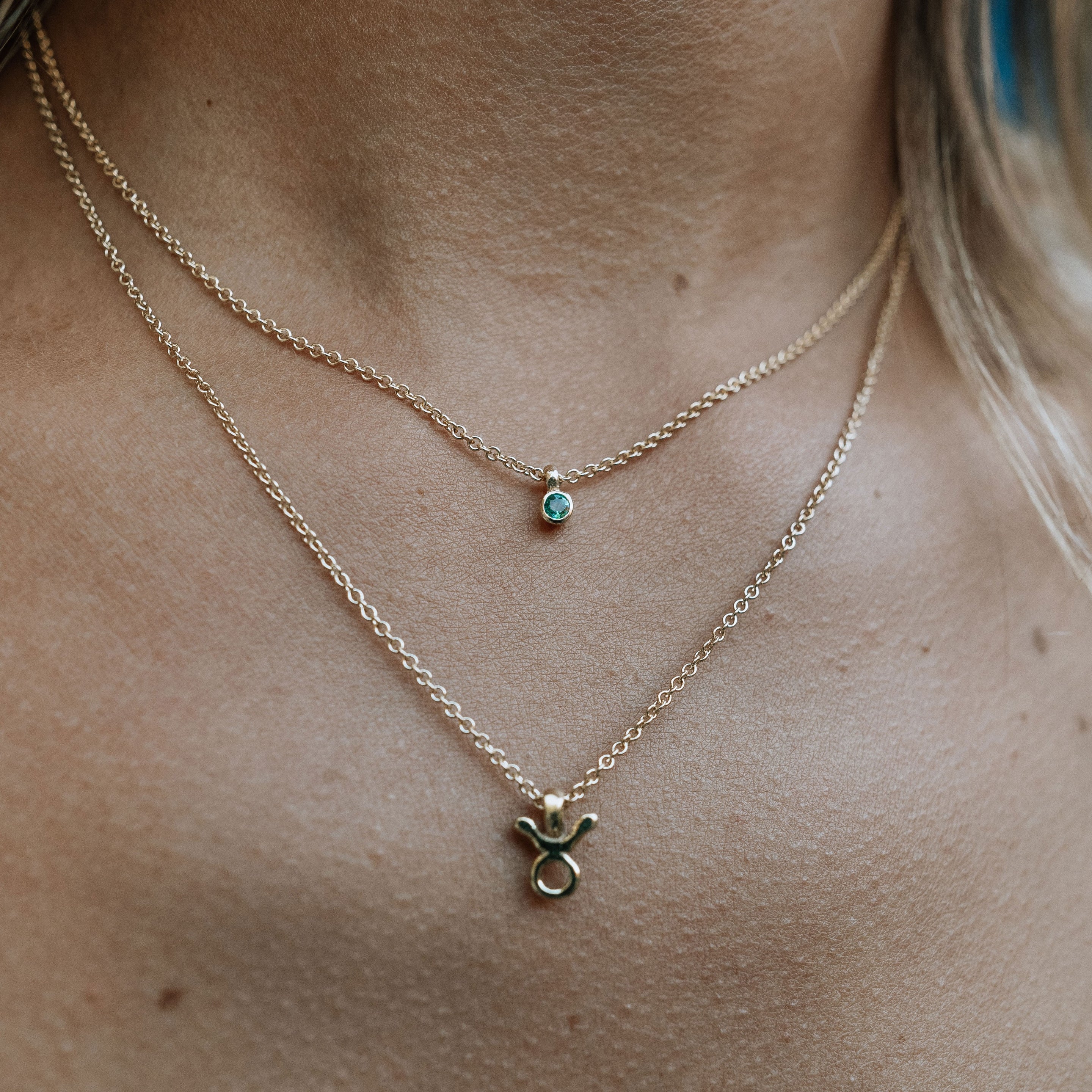 The Mini Emerald Necklace is made using 100% recycled solid 9ct gold & set with a 3mm emerald. Wear alone or layer with other DD necklaces to create your own unique look!