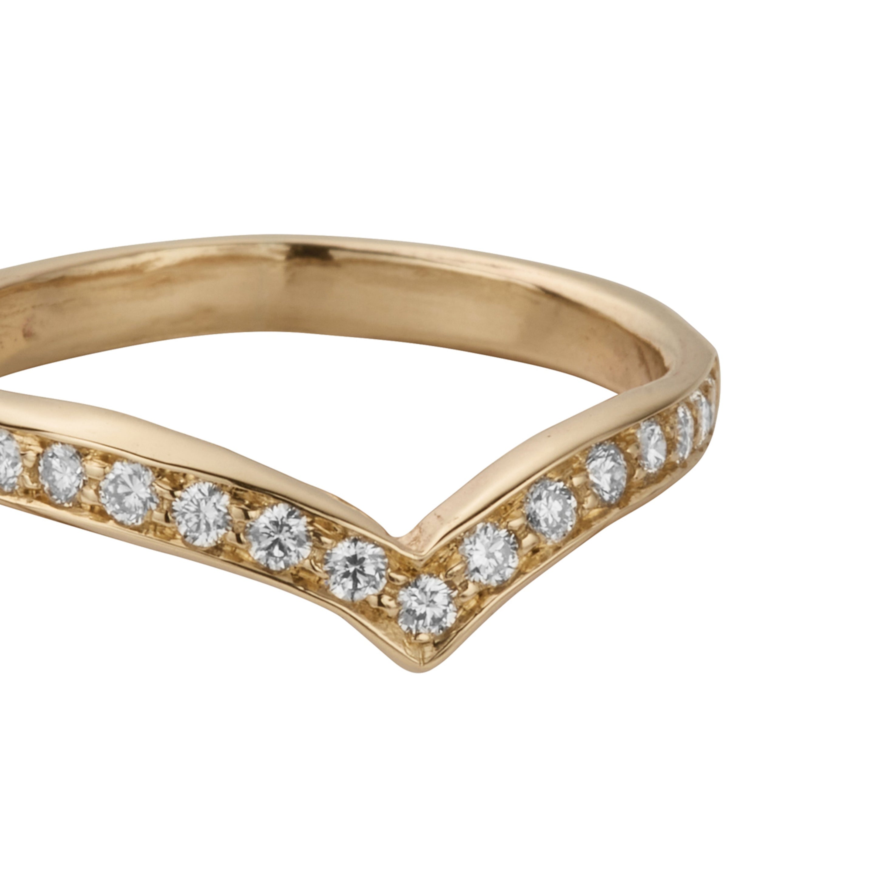 The Gold Wishbone Band is made using 100% recycled solid 9ct gold & has been hand set with 15 sparkly diamonds to create this truly unique piece.