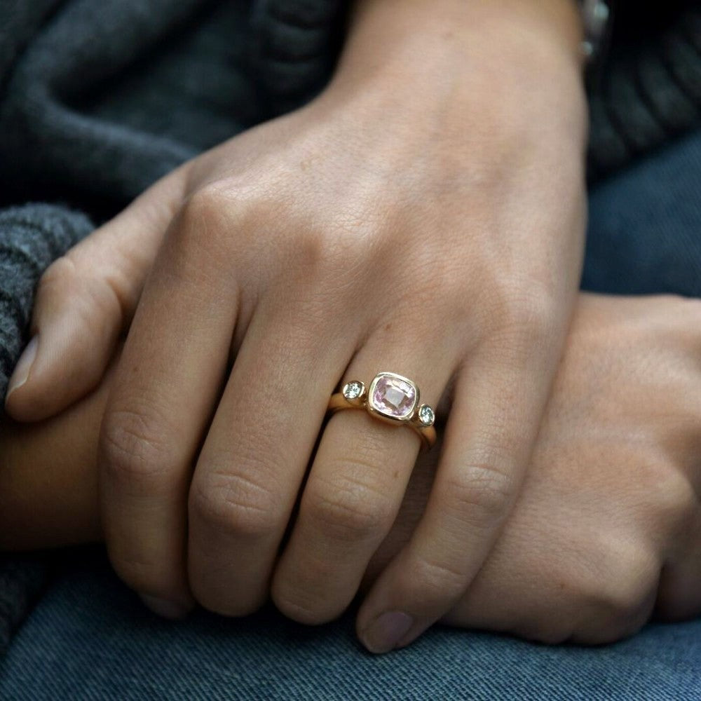 This is a 9ct Gold unique hand carved and bespoke ring with a beautifully set subtle Pink Sapphire flanked by two Diamonds. Daniella chose to set the stones in yellow gold to create a soft, warm and easy to wear ring. Named after the Egyptian Goddess of Love, the Hathor was inspired by vintage jewellery. Daniella loves the idea of jewellery that has been buried for thousands of years and creates pieces with a similar charm and character, this is her inspiration behind the Cinderella collection. Pink Sapphires bring wisdom and true strength and diamond is the 'stone of invincibility' bringing courage to it's wearer. A truly breathtaking piece that would make a great engagement ring.