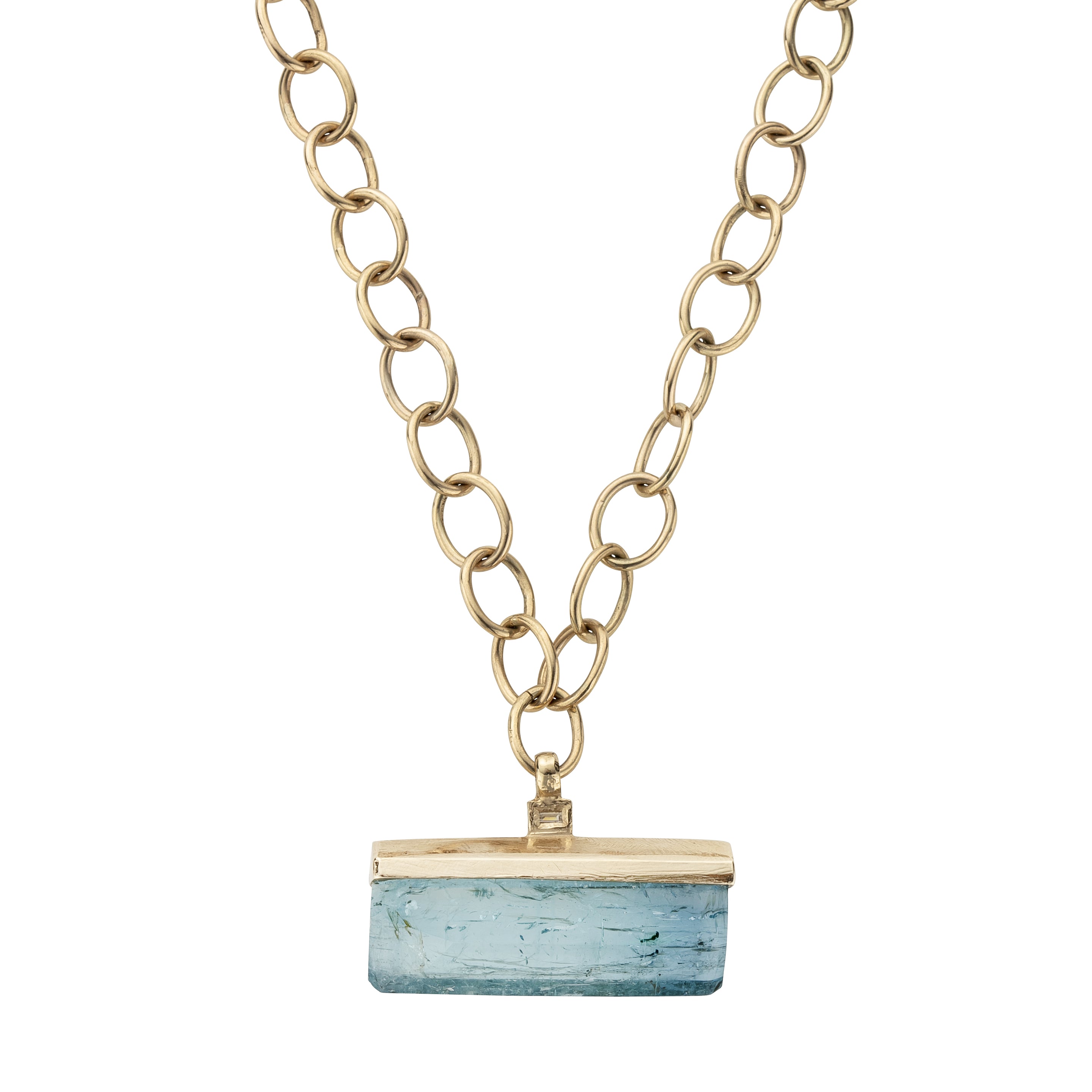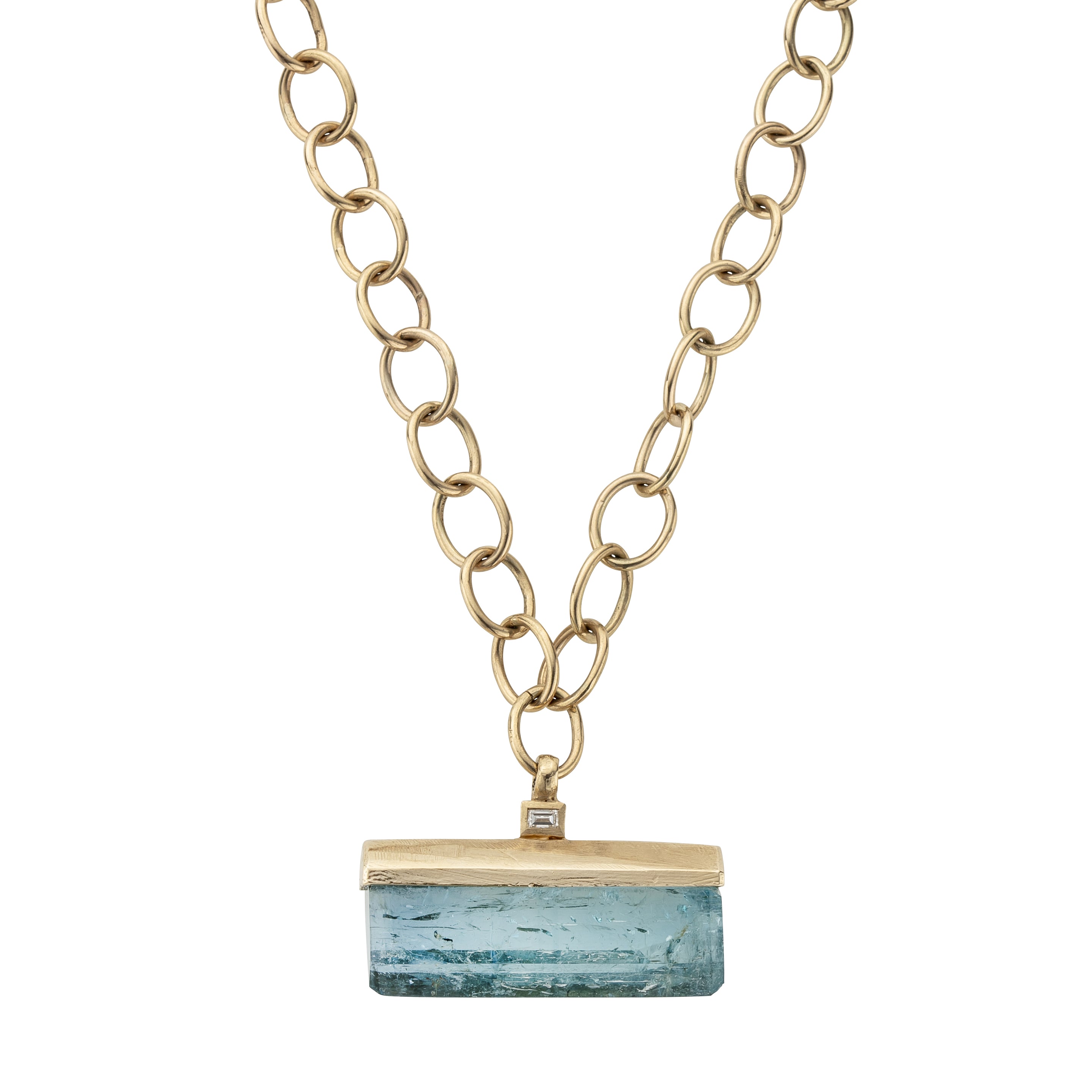 Daniella fell in love with this unusual aquamarine stone as soon as she saw it. The designer wanted to give it a new lease of life by complimenting its shape with a setting that would allow light to shine through & enhance its natural beauty. Paired with a sparkly baguette diamond to add a twinkle of elegance to this bold necklace.