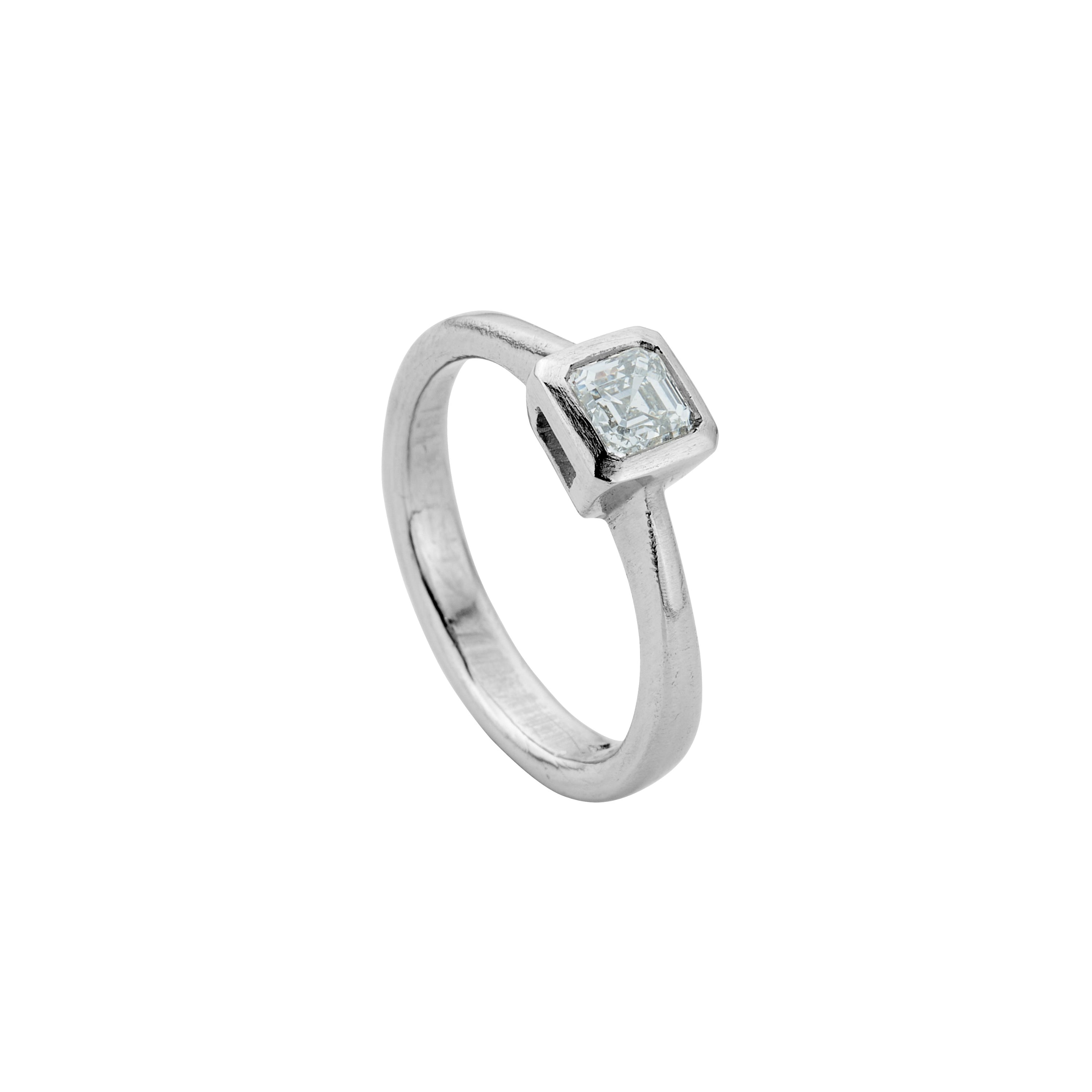 A 0.52ct asscher cut diamond has been lovingly hand set into a platinum setting to create this unique new design. Named Merope after one of the seven Pleiades (or Seven Sisters).
