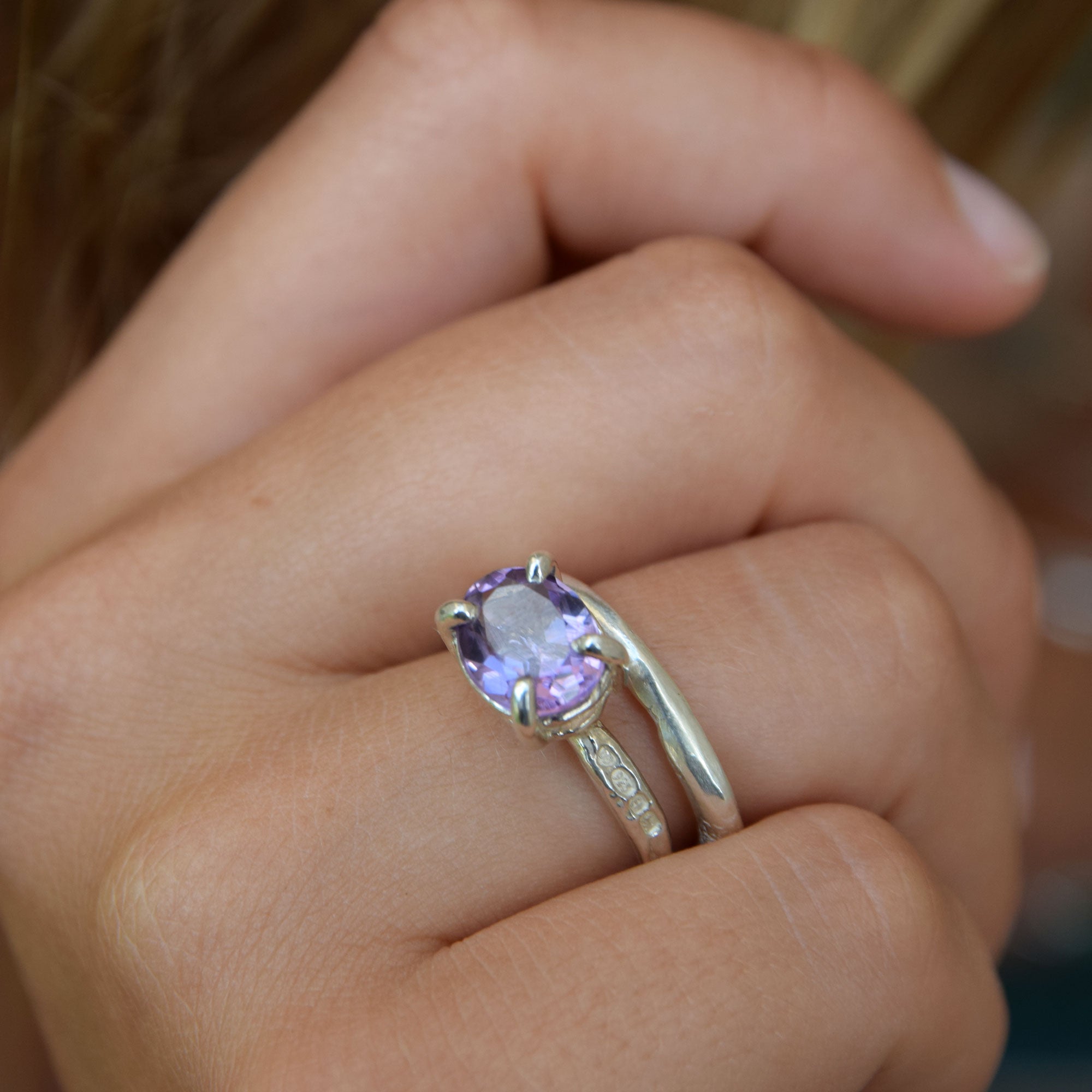 Handcrafted in England using 100% recycled sterling silver and set with a responsibly sourced amethyst stone by the esteemed British jewellery brand Daniella Draper. Believed to promote calmness and clarity, amethyst resonates with those seeking balance and serenity. Perfect for stacking or wearing solo, this ring is versatile enough for both casual and special occasions.