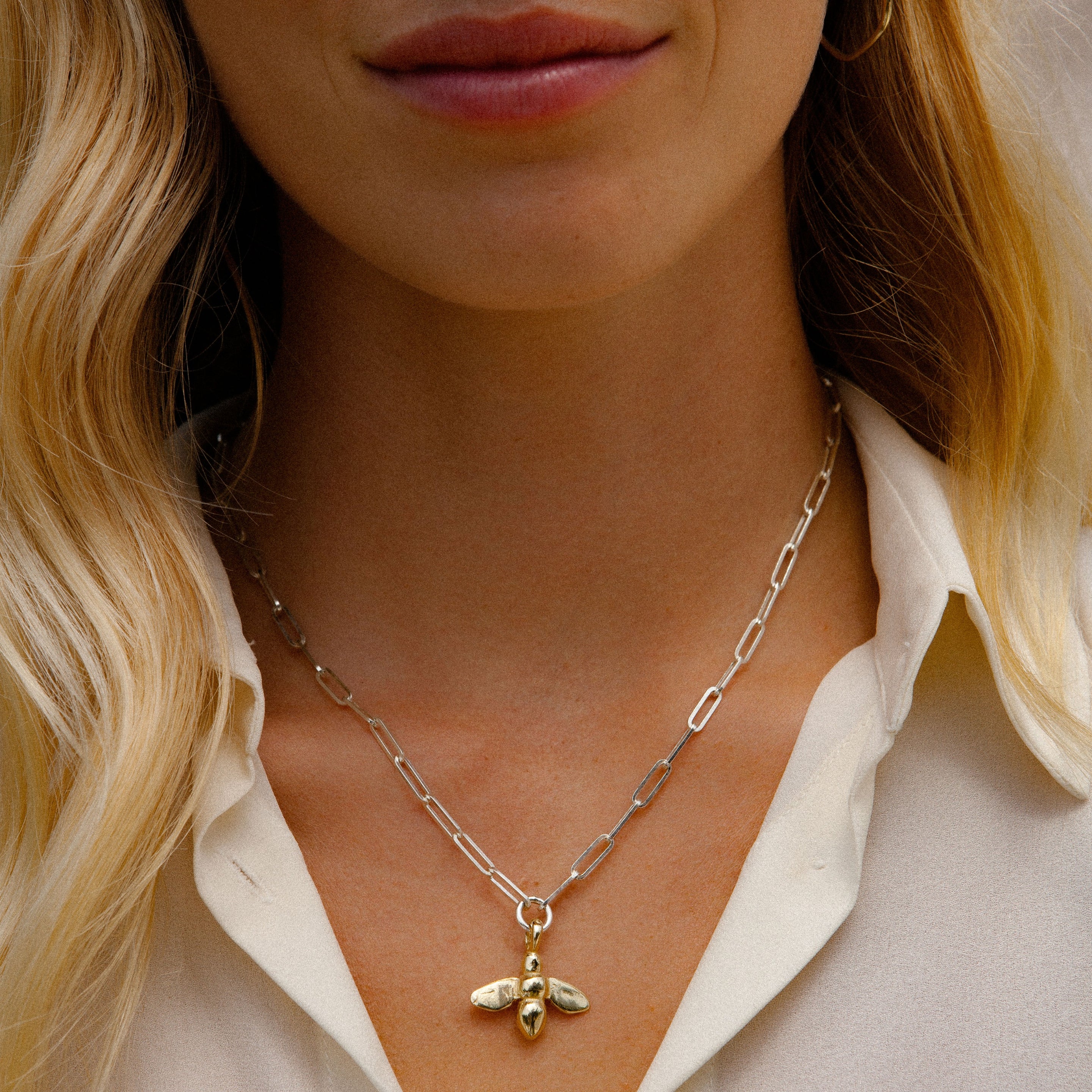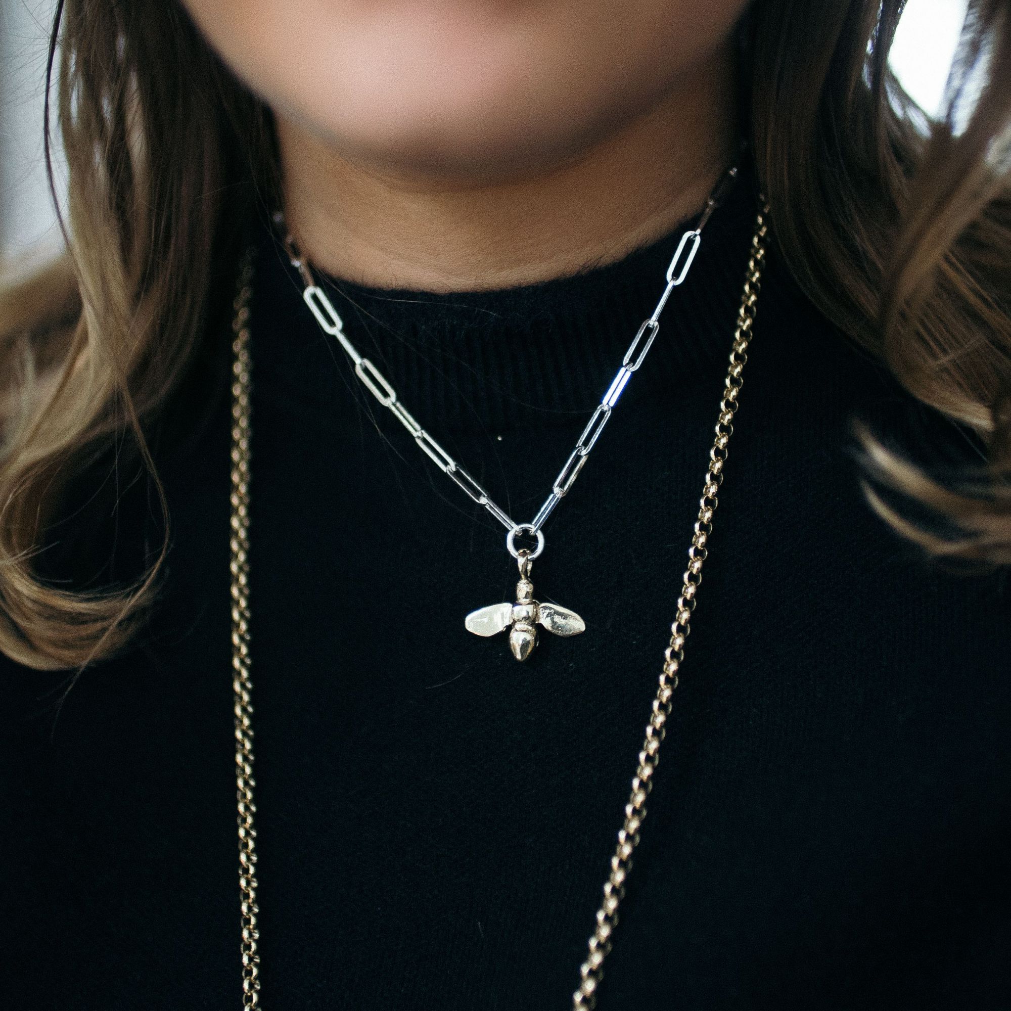 The Large Honey Bee Trace Chain Necklace is made using 100% recycled solid sterling silver & 9ct yellow gold. The Trace Chain looks great worn alone or layered with other DD necklaces to create your own unique look!
