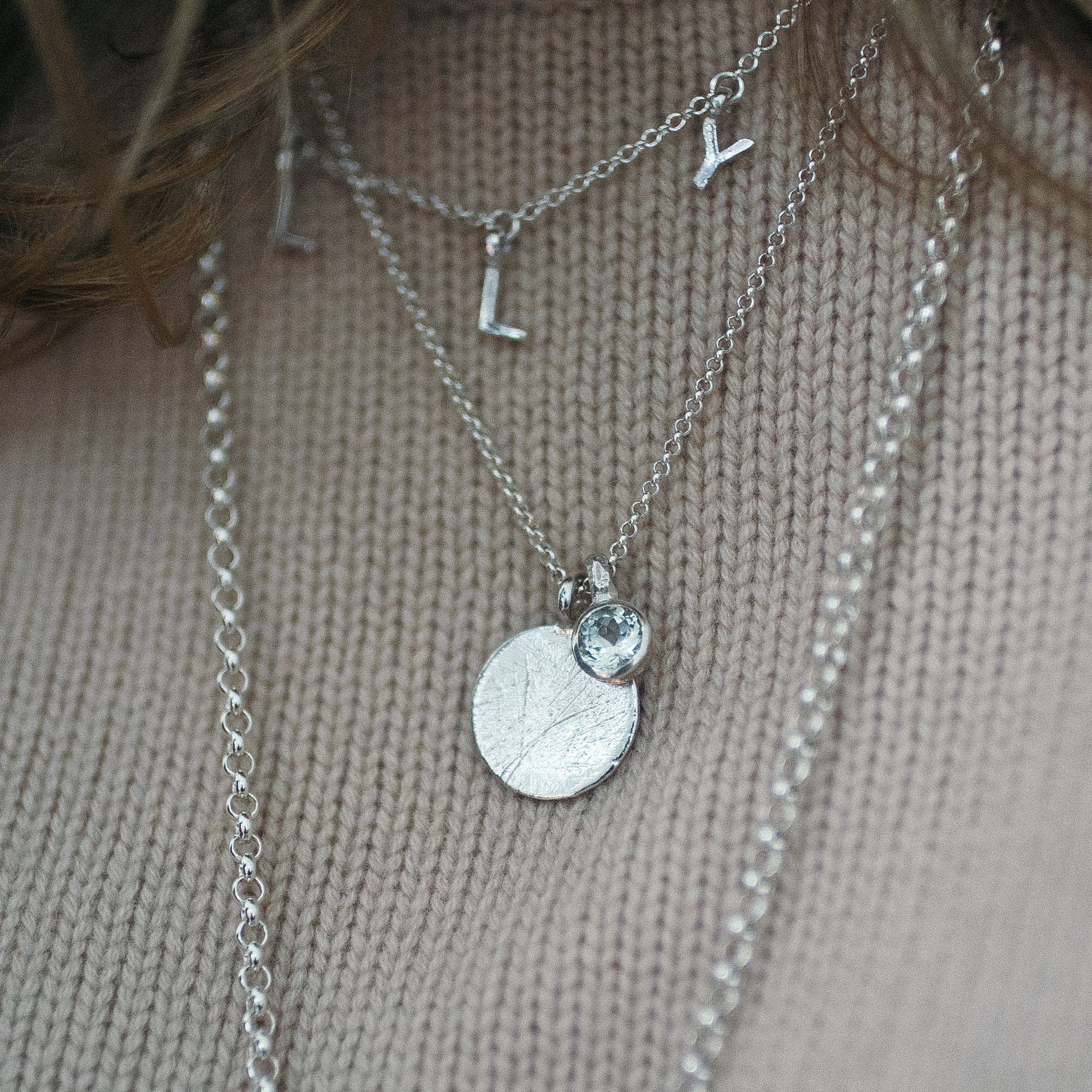 This is a solid Sterling Silver chain adorned with a Large Moon charm and an Aquamarine stone pendant. The moon is universally representing the rhythm of time as it embodies the cycle. The phases of the moon symbolise immortality, eternity and enlightenment. Shimmering with the natural blue & turquoise hues of the Aquamarine, it is the stone of eternal youth and happiness. This unisex necklace is a stunning piece and can be worn at two different lengths: 18 or 20 inches. The birthstone for March, Aquamarine was believed to be the treasure of mermaids, and was used by sailors as a talisman of good luck, fearlessness & protection.