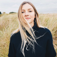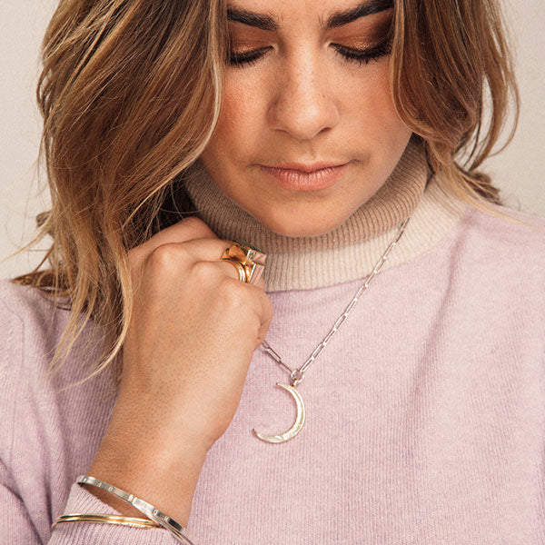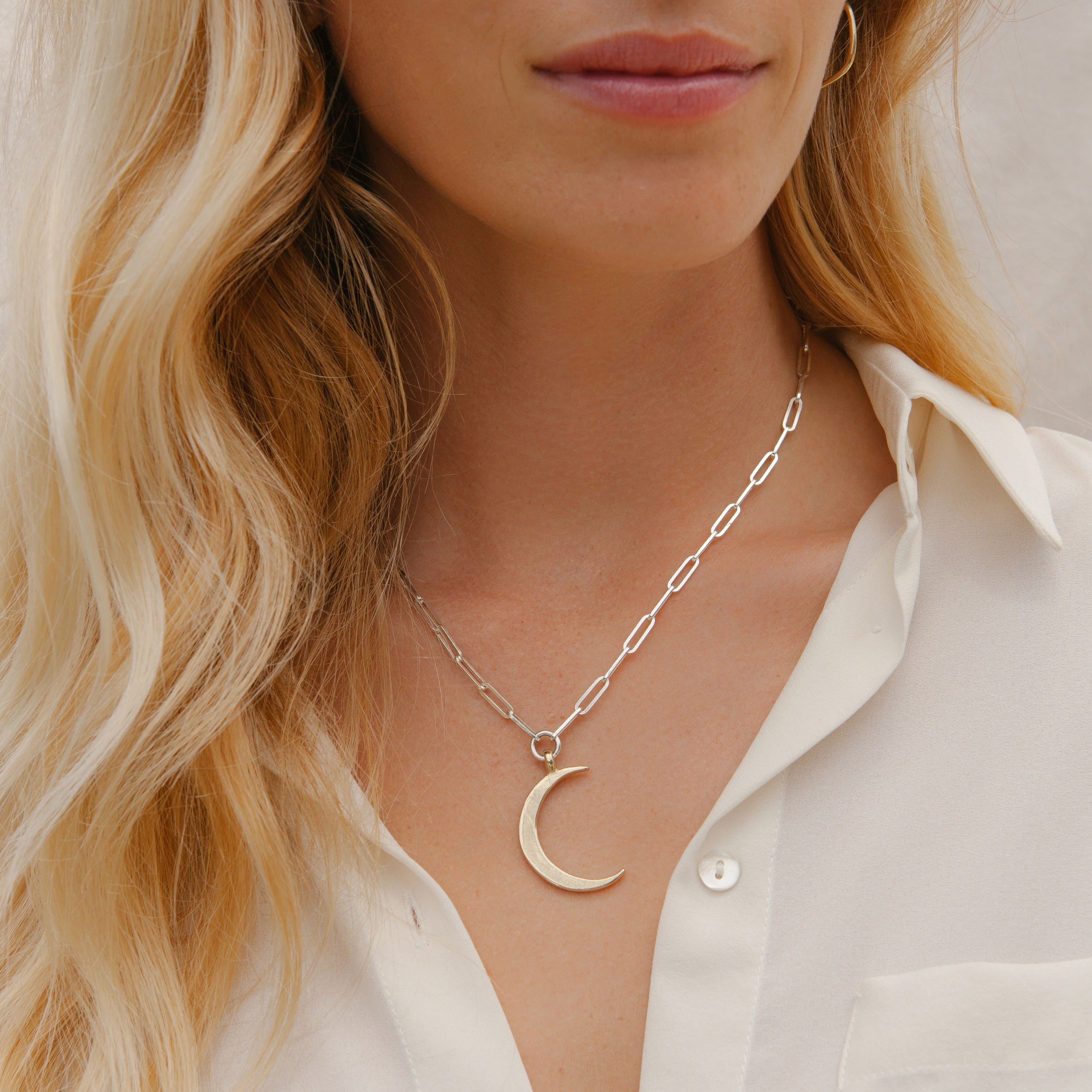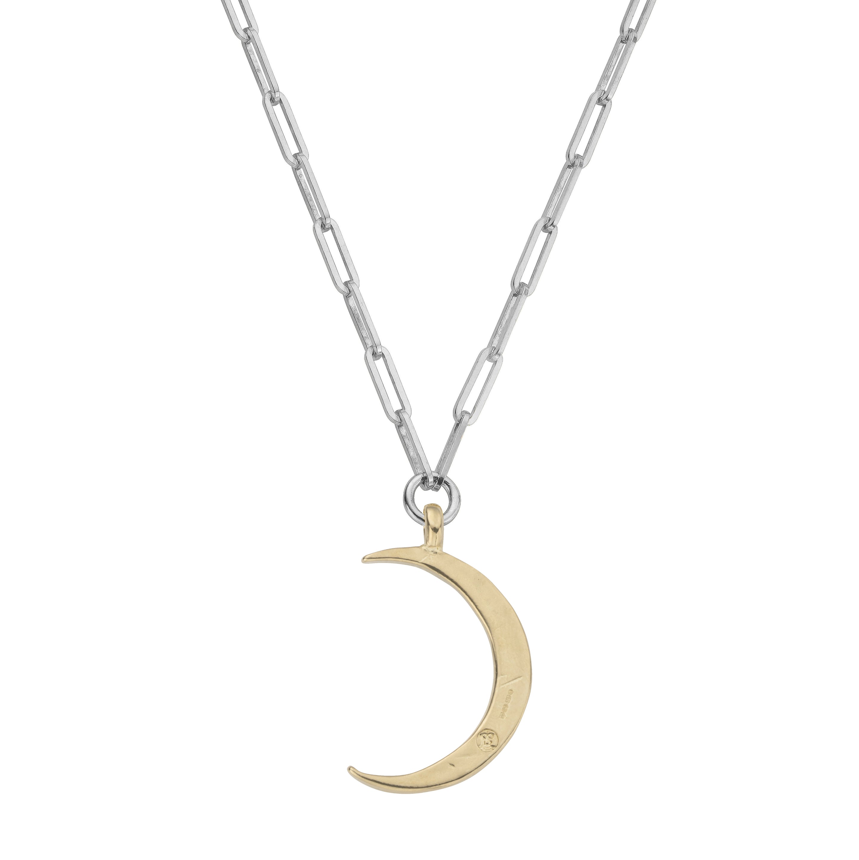 The Large Crescent Moon Trace Chain Necklace is made using 100% recycled solid sterling silver & 9ct yellow gold. The Trace Chain looks great worn alone or layered with other DD necklaces to create your own unique look!
