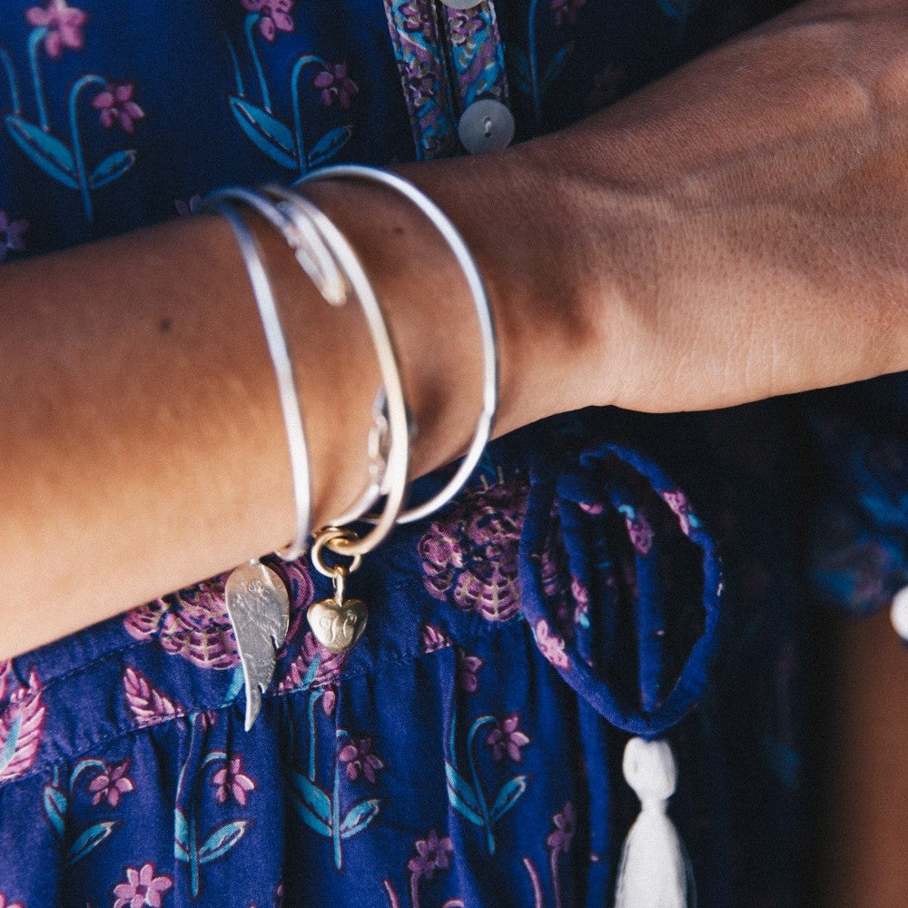 The Maxi Grateful Heart Bangle is made using 100% recycled solid sterling silver & 9ct yellow gold. Wear alone or stack with other DD bangles to create your own unique look!