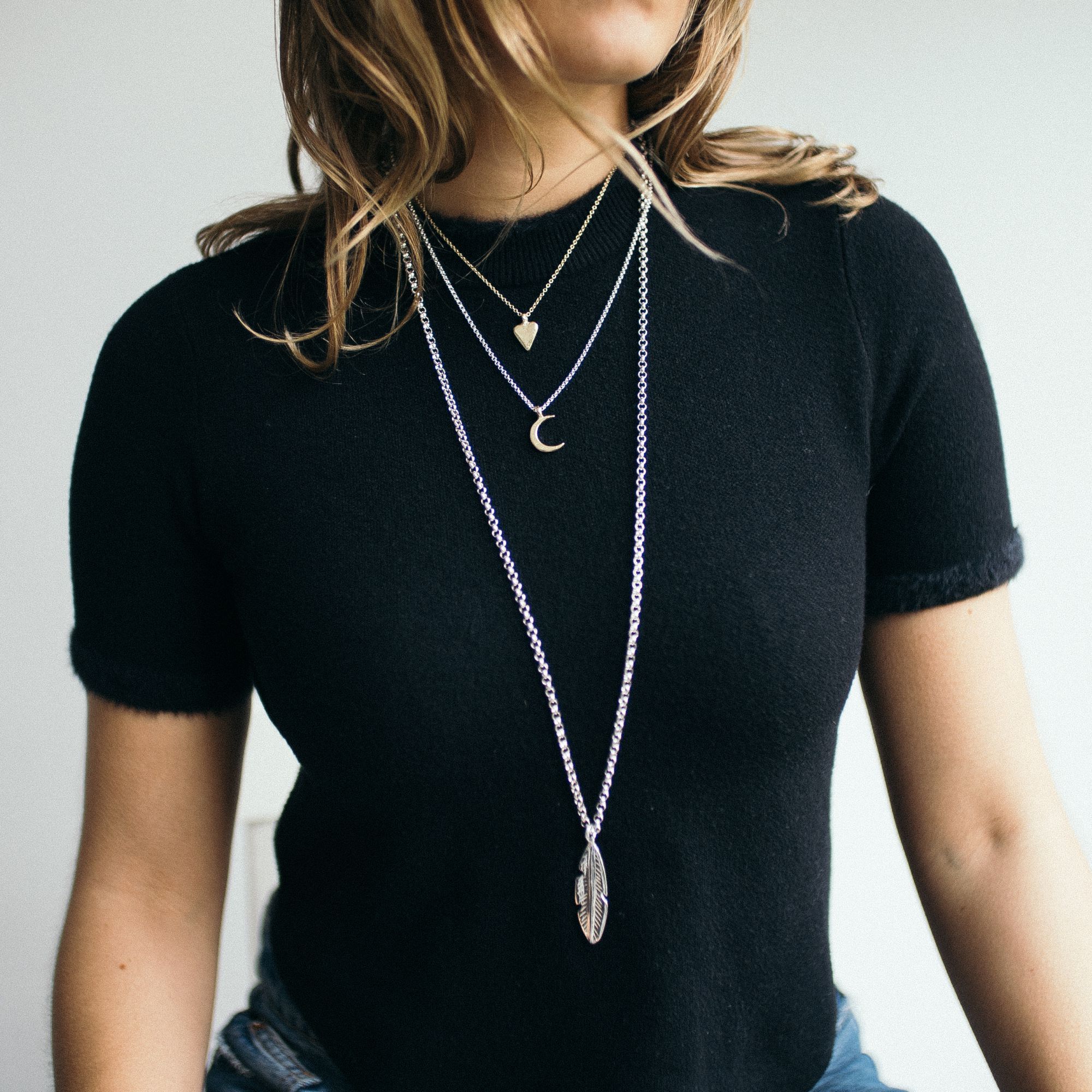 The Medium Crescent Moon Necklace is made using 100% recycled solid sterling silver & 9ct yellow gold. Wear alone or layer with other DD necklaces to create your own unique look!