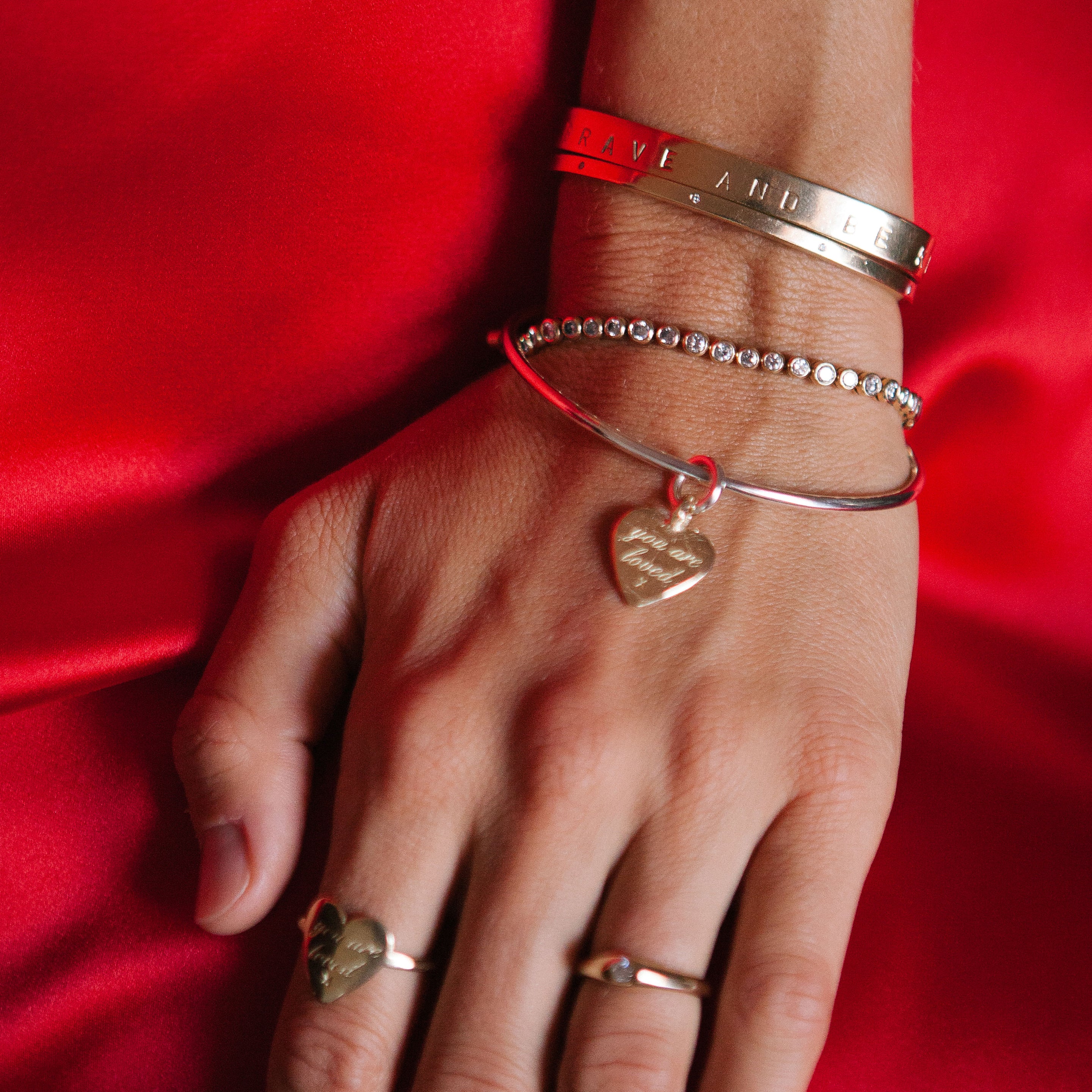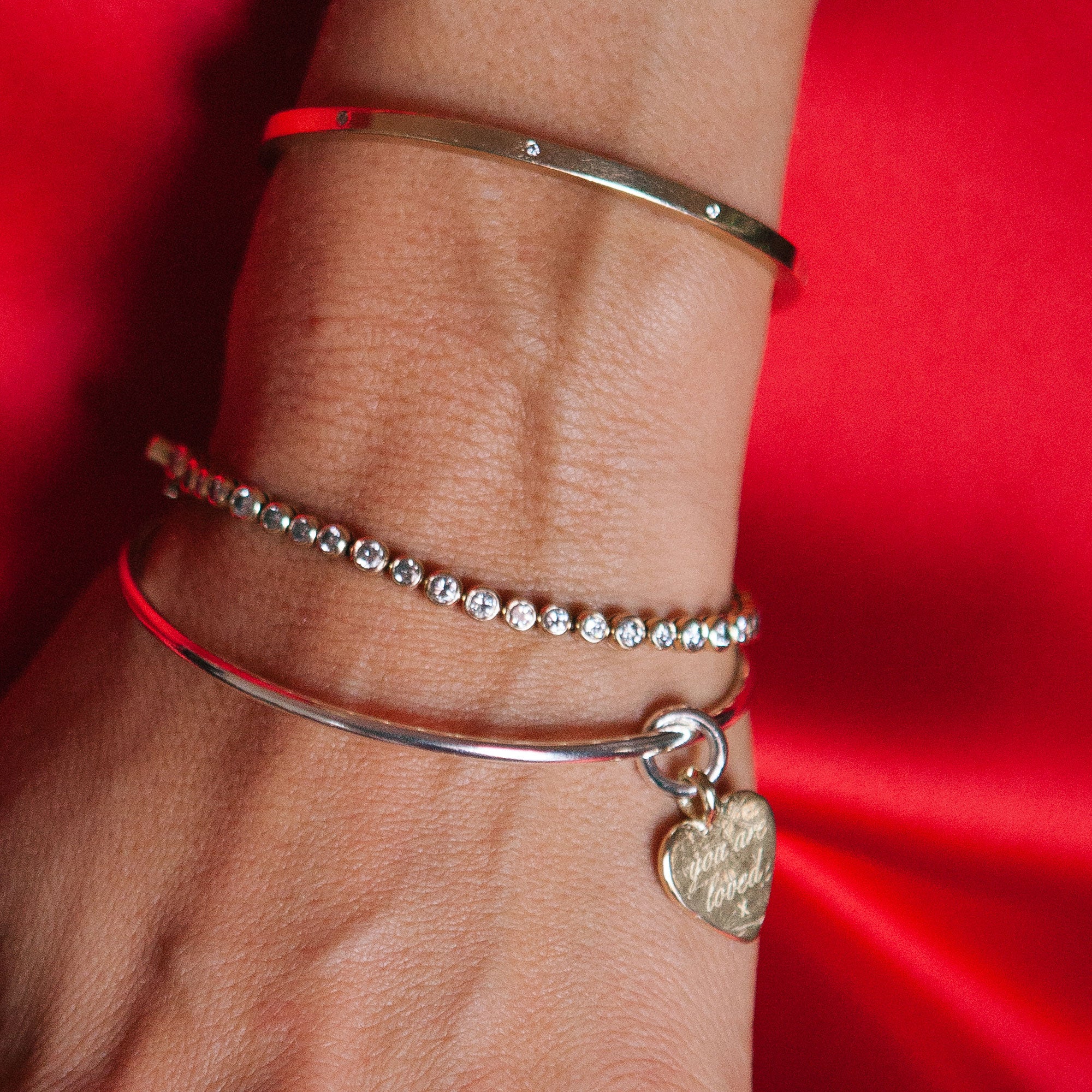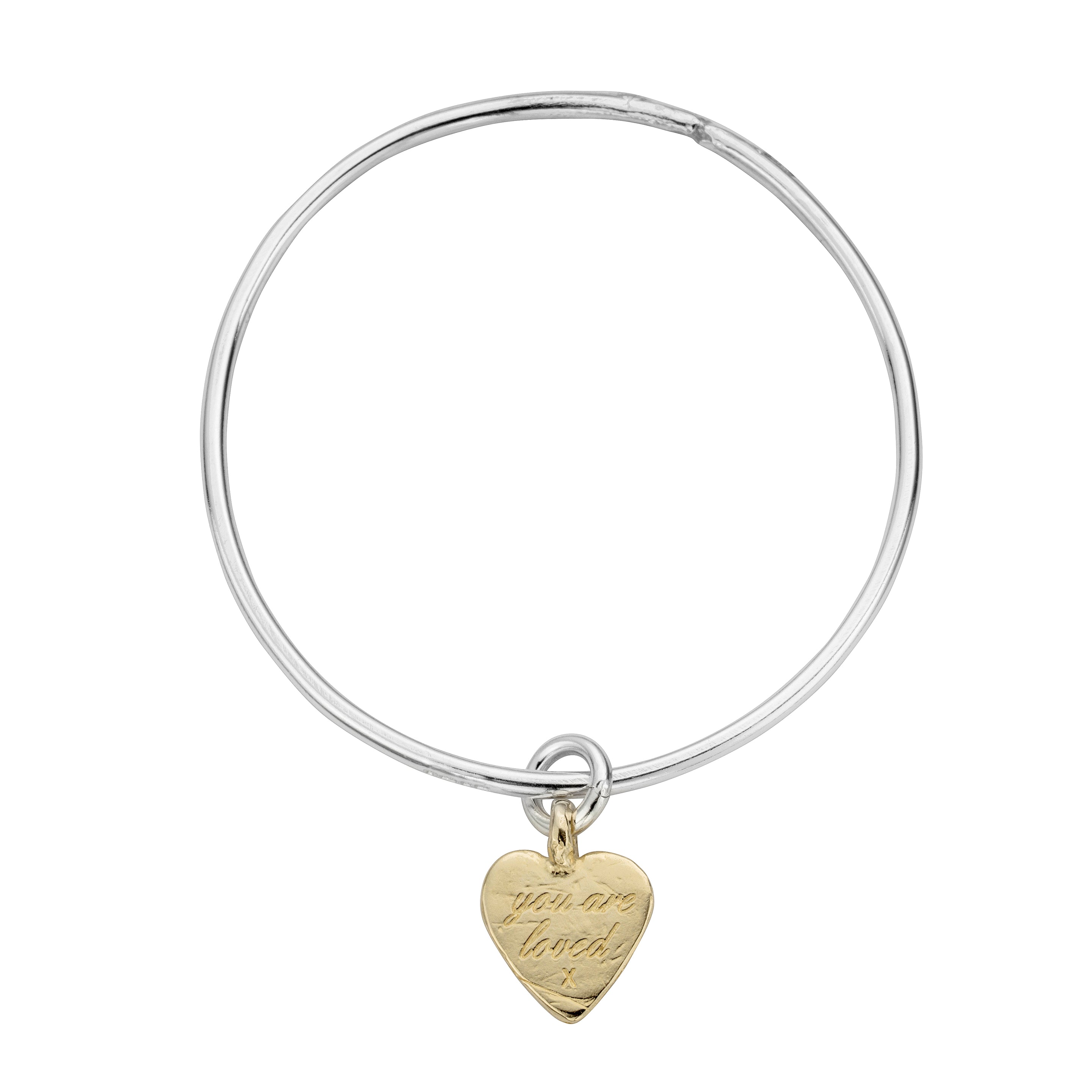 The Medium 'You Are Loved' Bangle is made using 100% recycled solid sterling silver & 9ct yellow gold. Wear alone or stack with other DD bangles to create your own unique look!