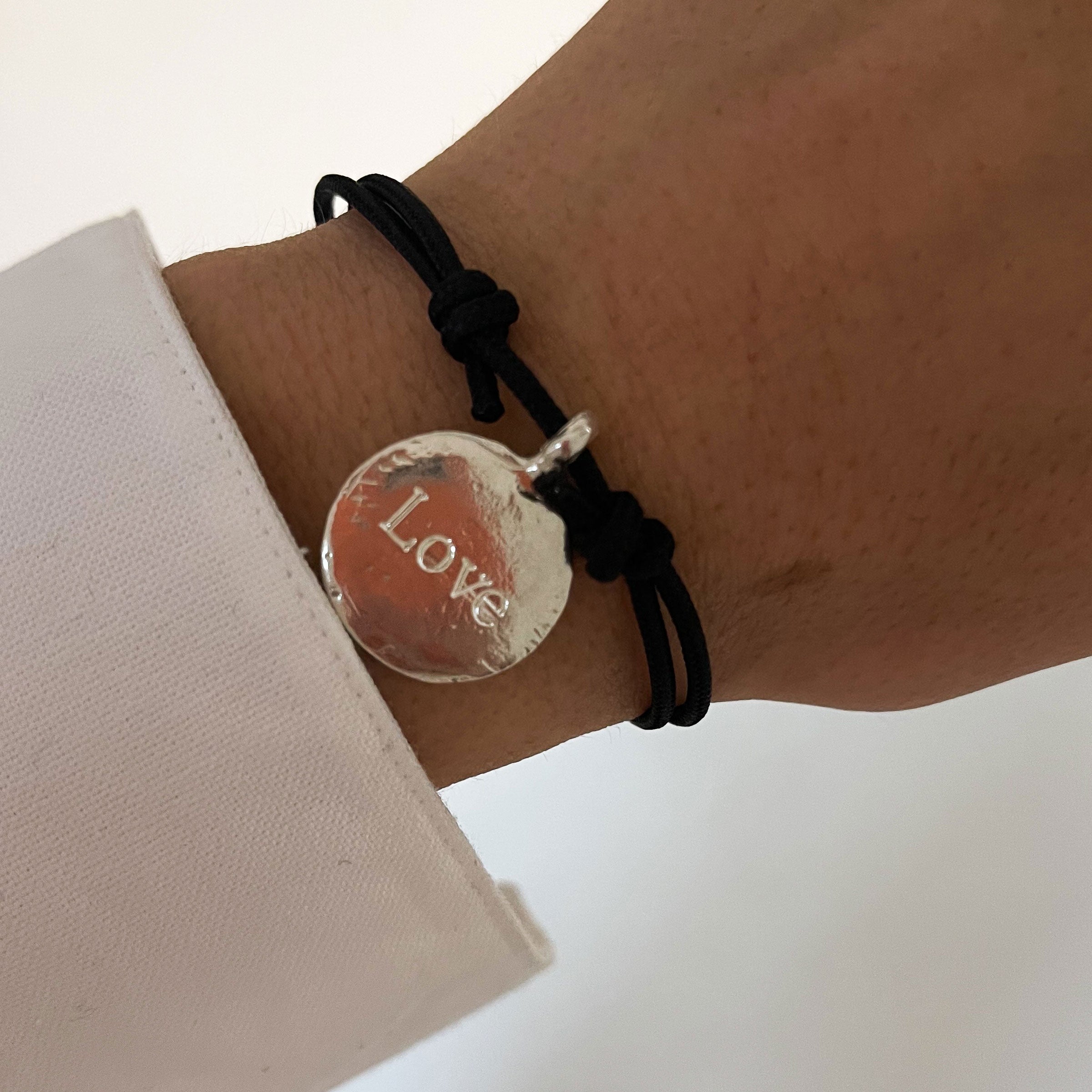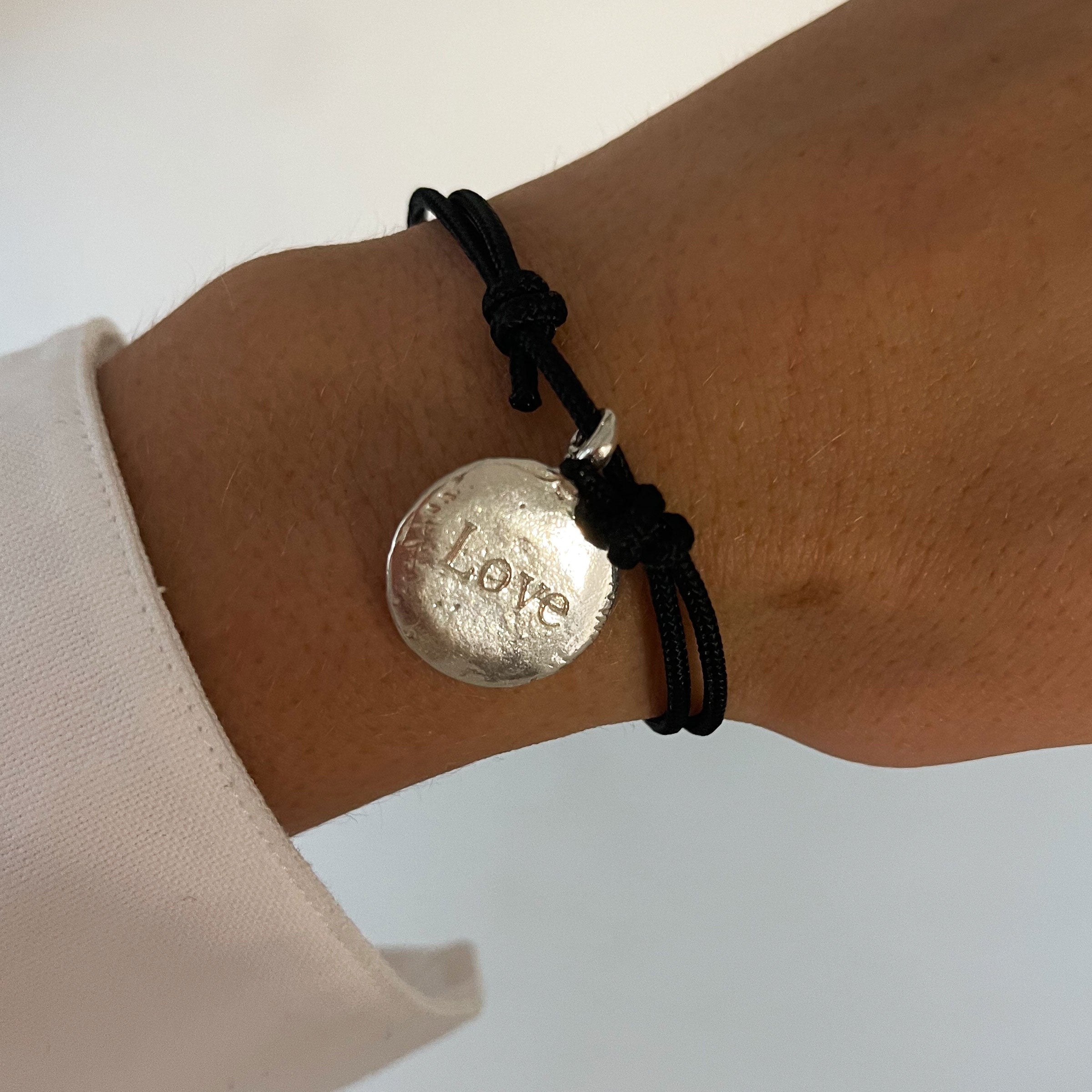This is a solid sterling silver round charm, engraved with the word "love", threaded onto an adjustable Sailing Rope bracelet, tied by a slip knot. Wonderfully elegant this piece makes a versatile addition to your jewellery box or the perfect present for a loved one.