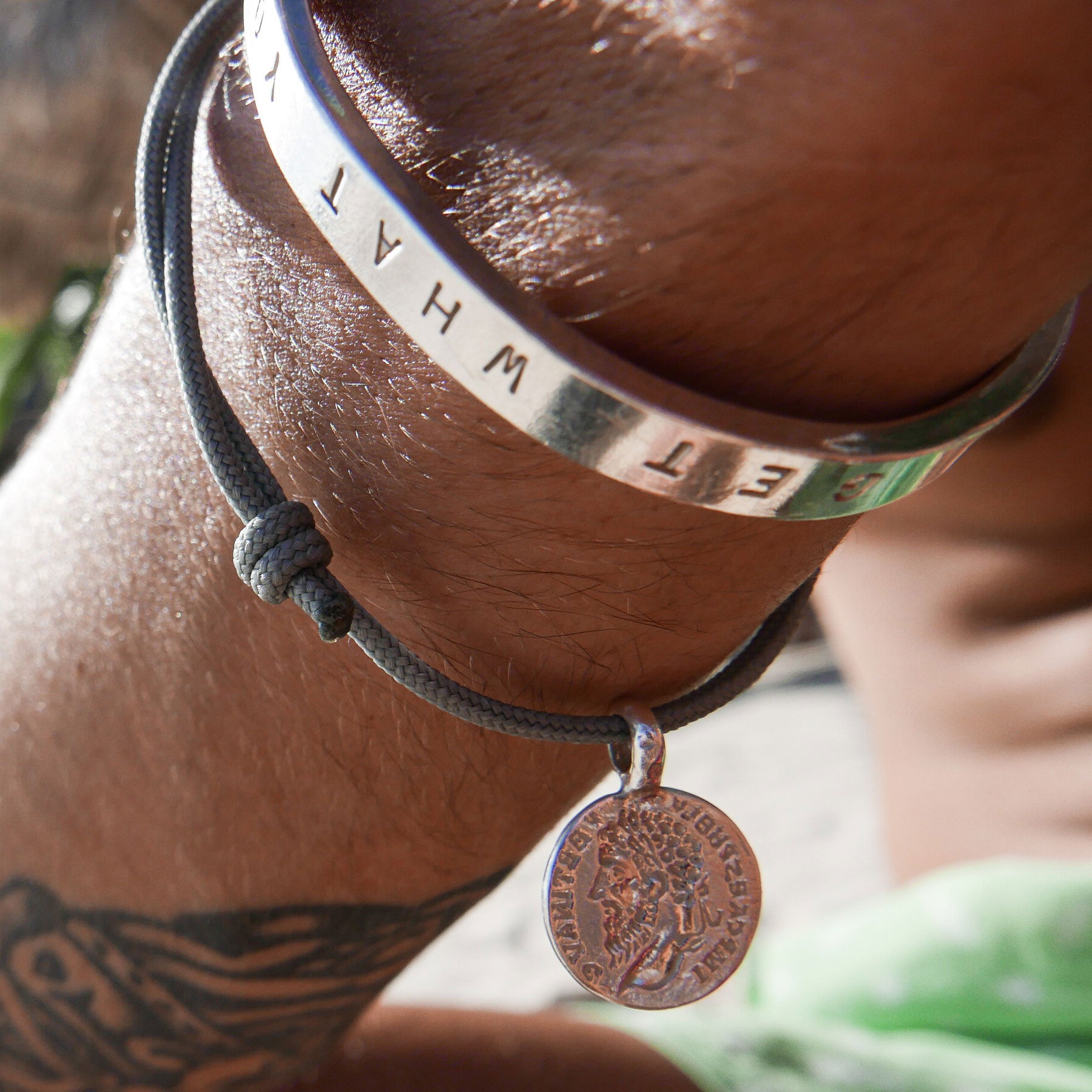 The Medium Roman Coin, made using 100% recycled solid sterling silver, is threaded onto an adjustable sailing rope. One of our most popular & easy to wear pieces, this sailing rope comes in three colours: black, pink or grey.