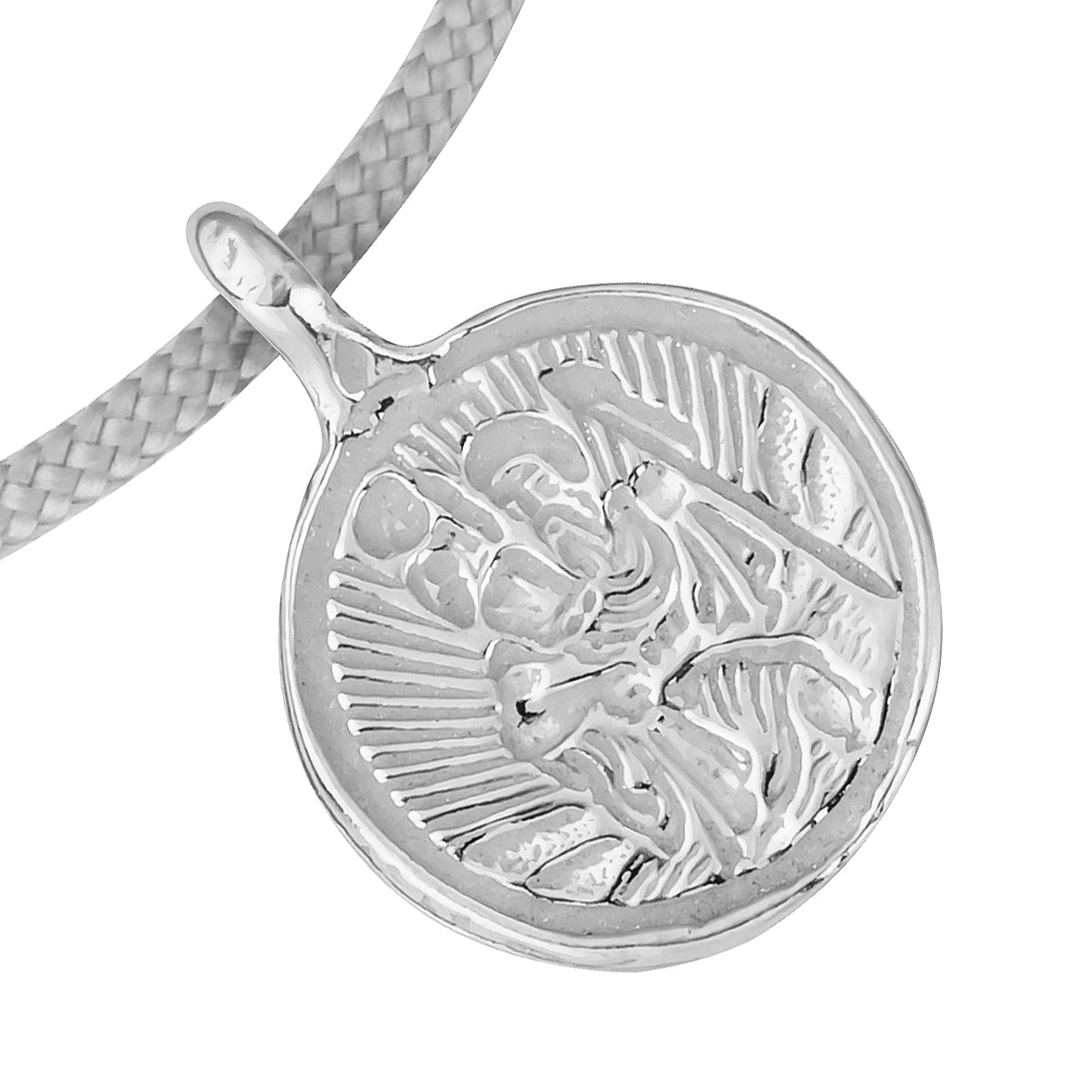 The Medium St Christopher, made using 100% recycled solid sterling silver, is threaded onto an adjustable sailing rope. One of our most popular & easy to wear pieces, this sailing rope comes in three colours: black, pink or grey.