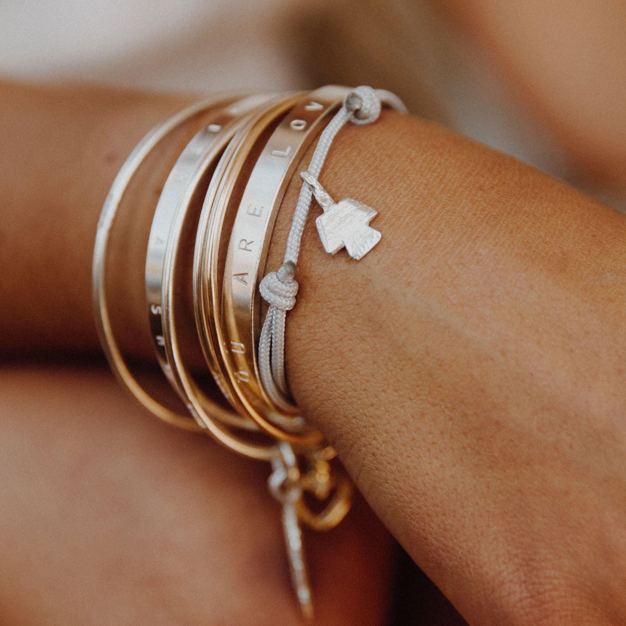 The Mini Angel, made using 100% recycled solid sterling silver, is threaded onto an adjustable sailing rope. One of our most popular & easy to wear pieces, this sailing rope comes in three colours: black, pink or grey.