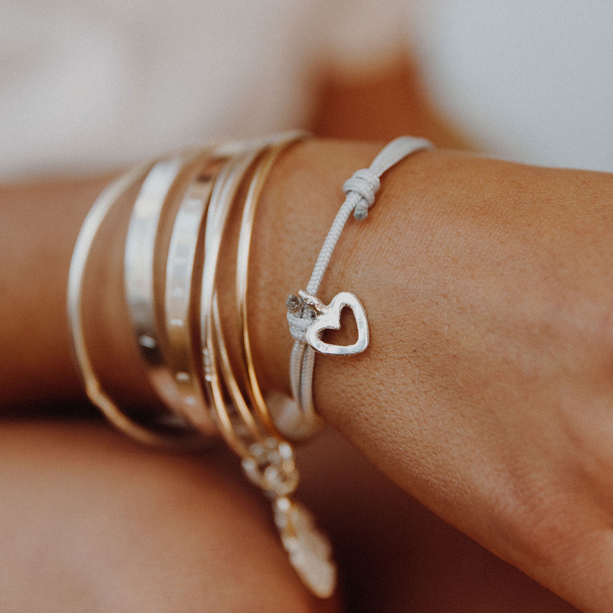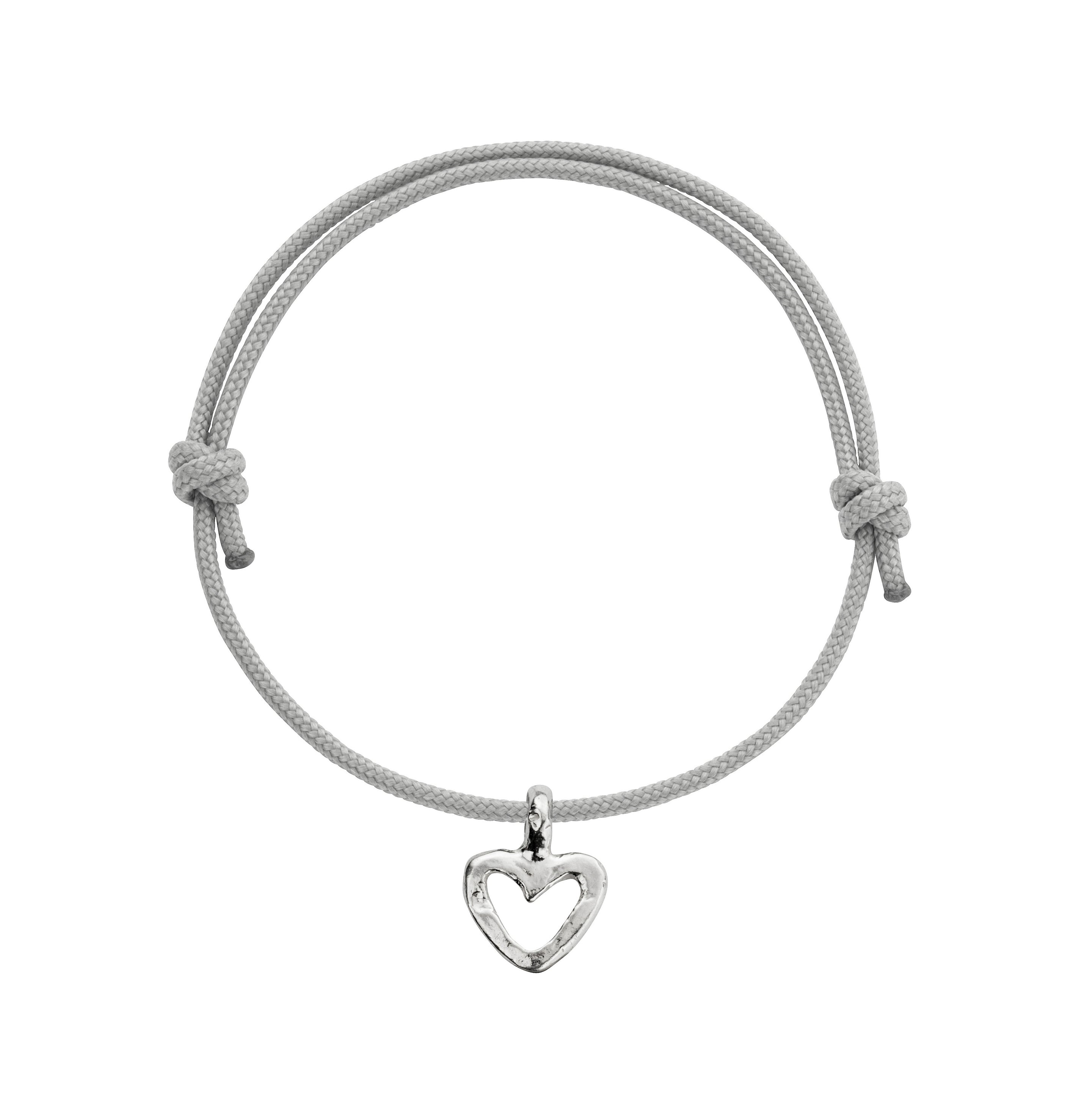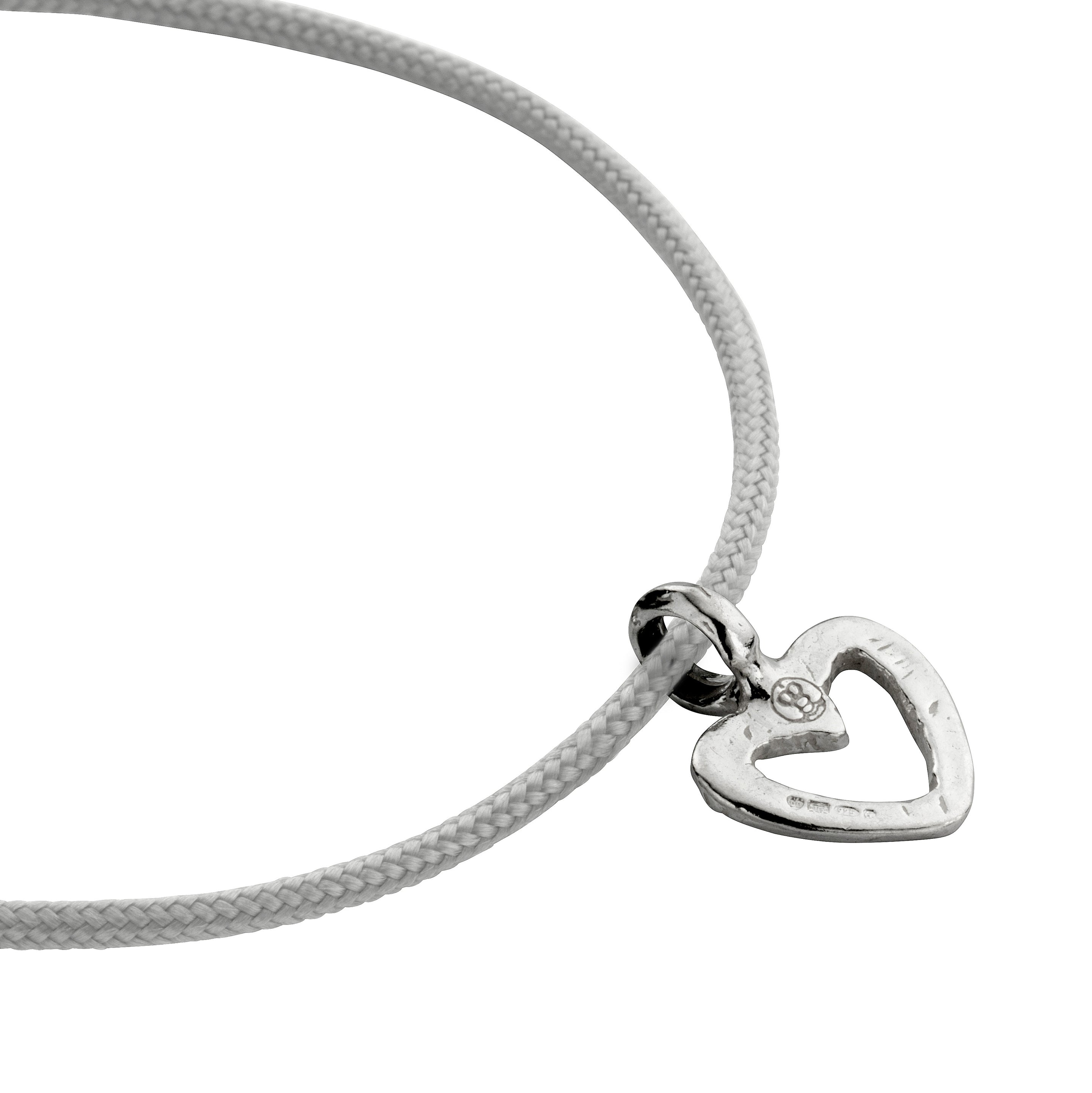 The Open Heart, made using 100% recycled solid sterling silver, is threaded onto an adjustable sailing rope. One of our most popular & easy to wear pieces, this sailing rope comes in three colours: black, pink or grey.